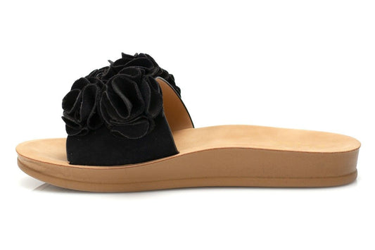 Дамски черни чехли с велурени цветя - Flo - Black