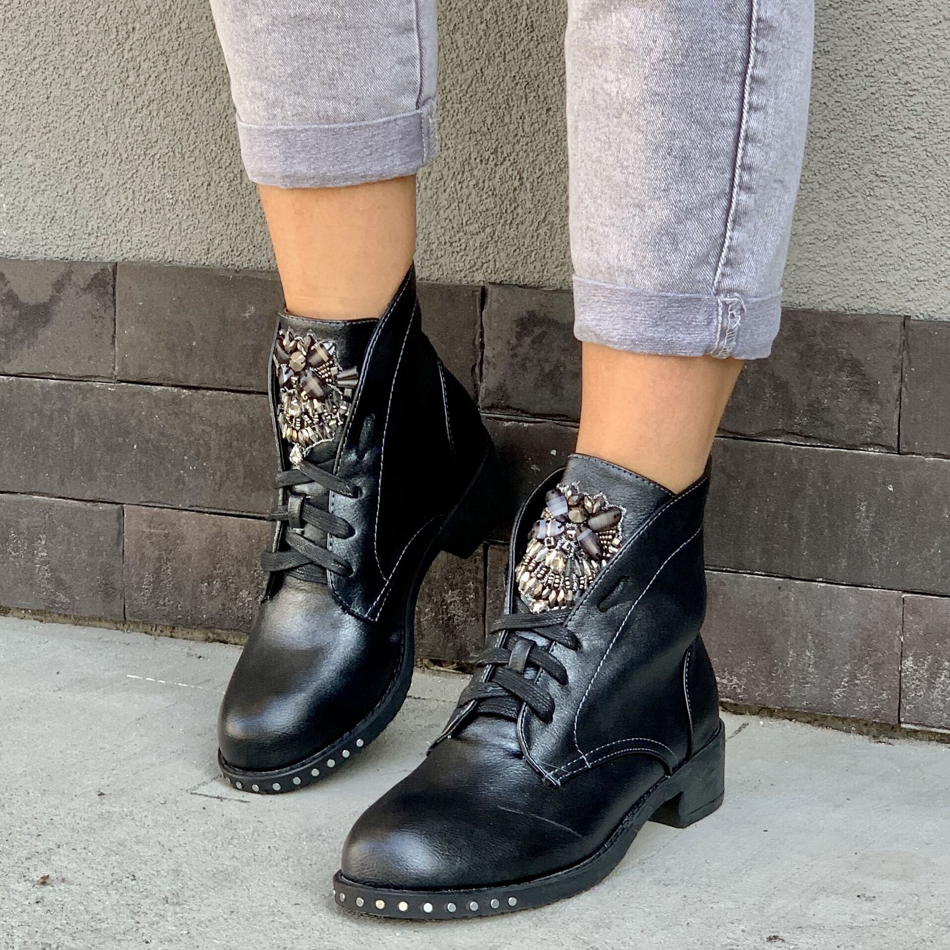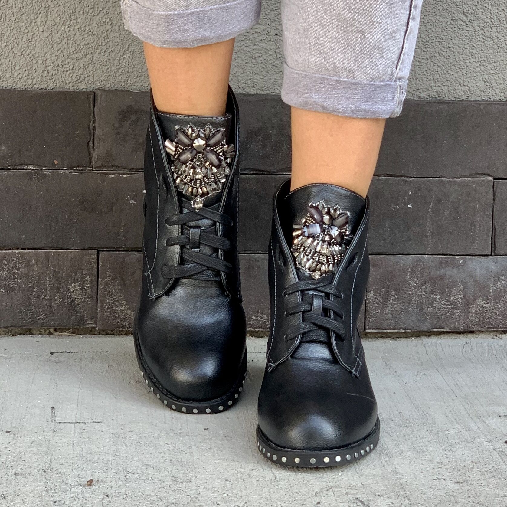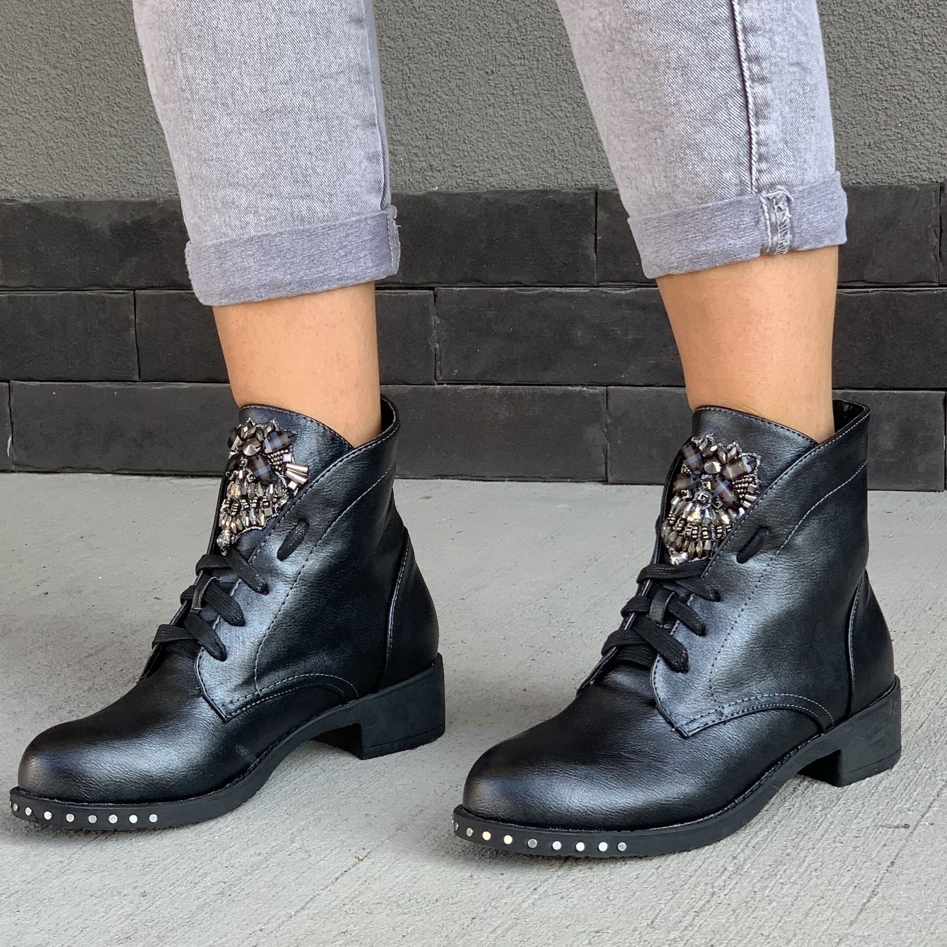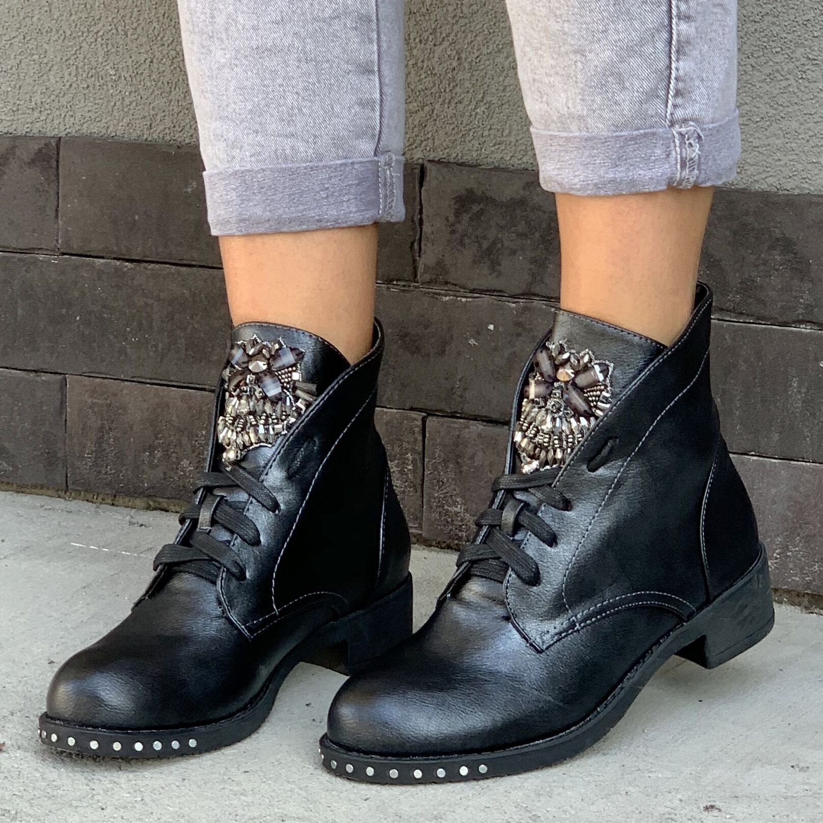 Ежедневни дамски боти в черен цвят. Изработени са от  еко кожа и камъчета в горната част на езика. Ботите имат връвки с който регулирате ширината на обувката.