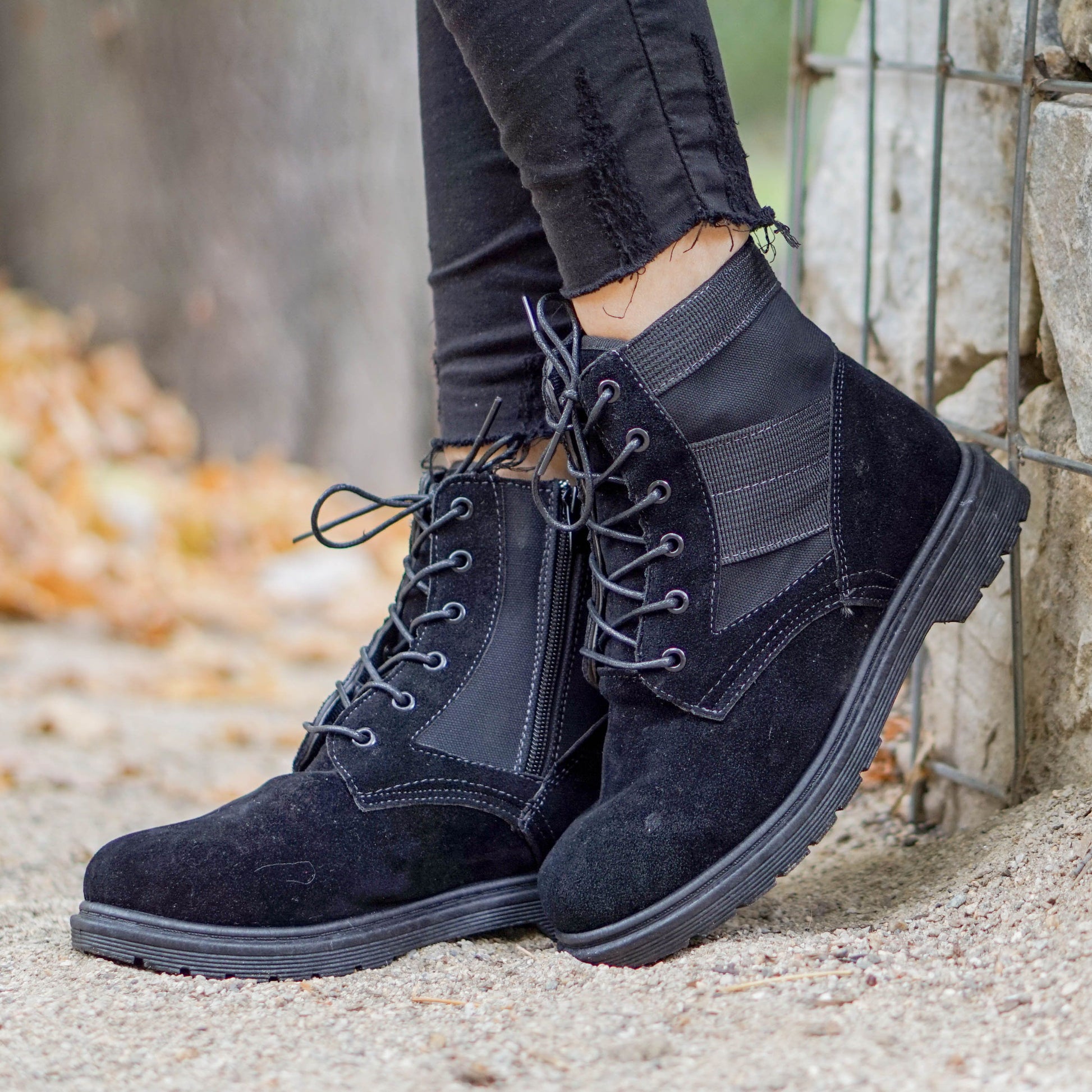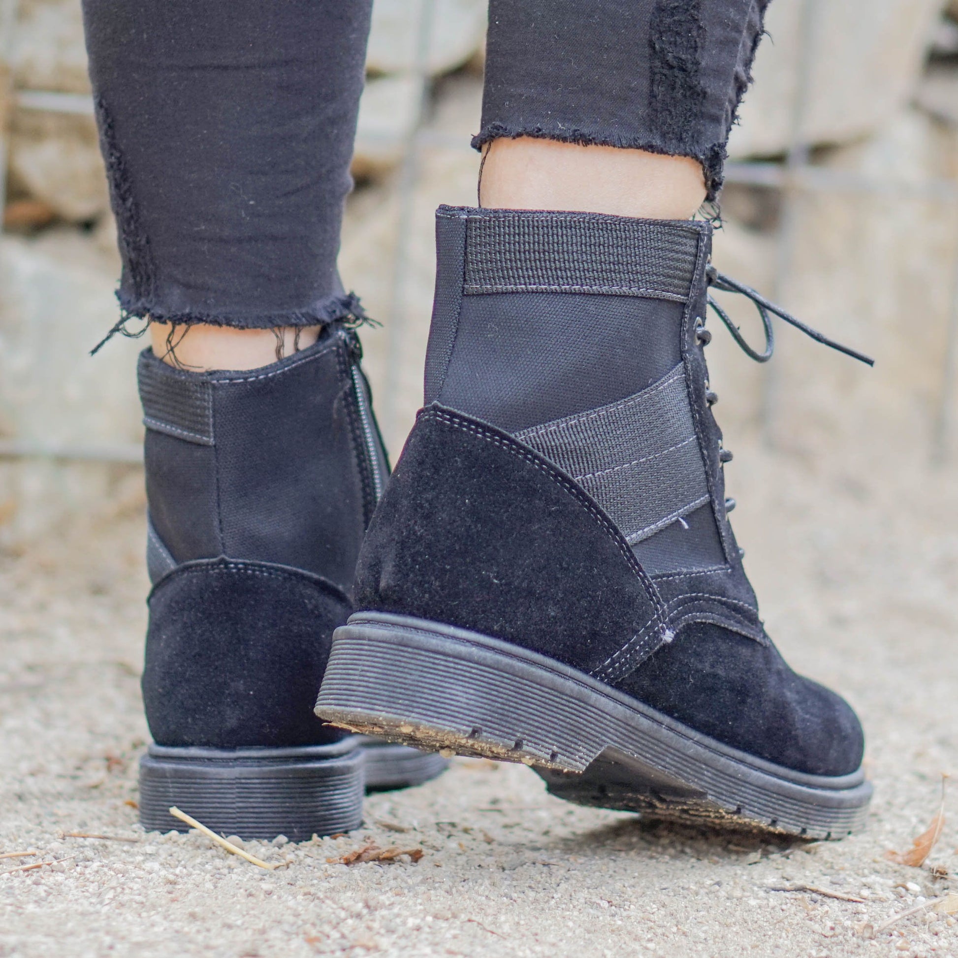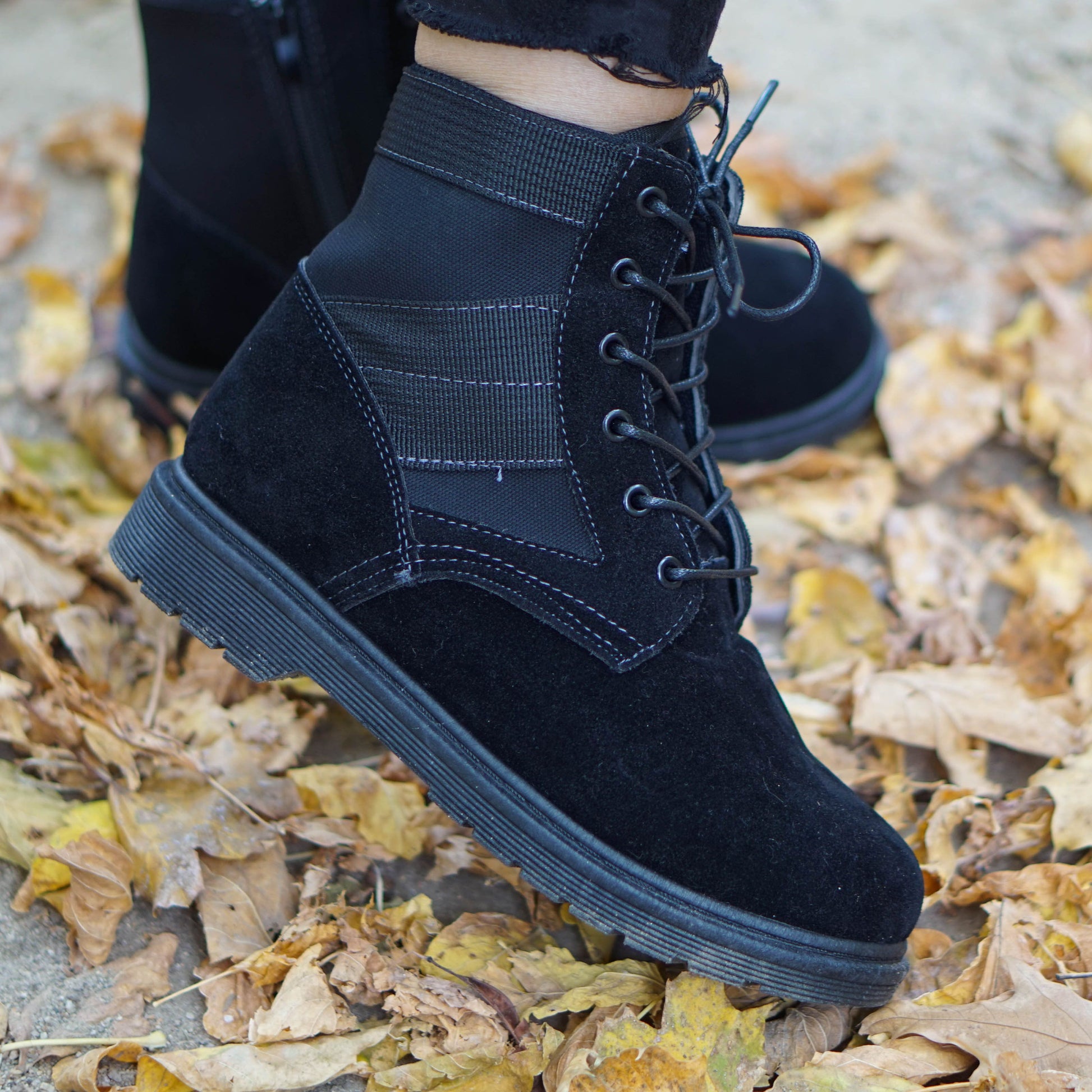 Дамски ежедневни боти в черен цвят. Ботите са изработени от велур с цип във вътрешната част. Модела е с връвки за решулиране на ширината.
