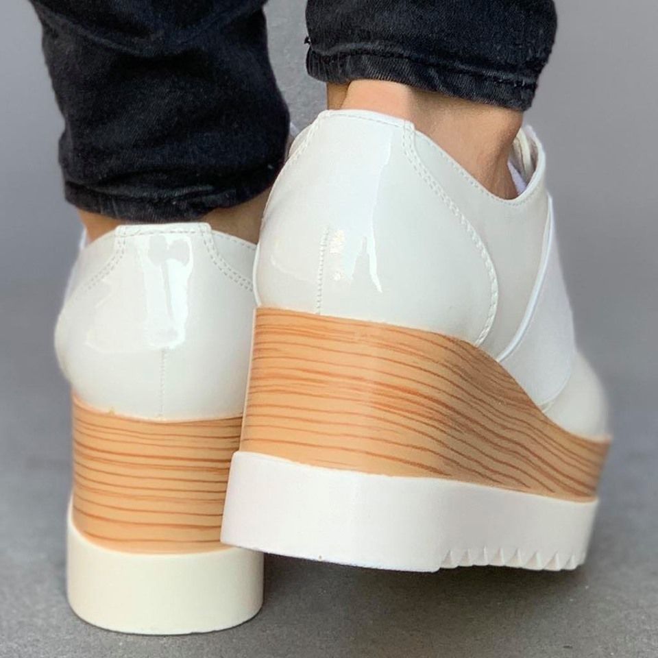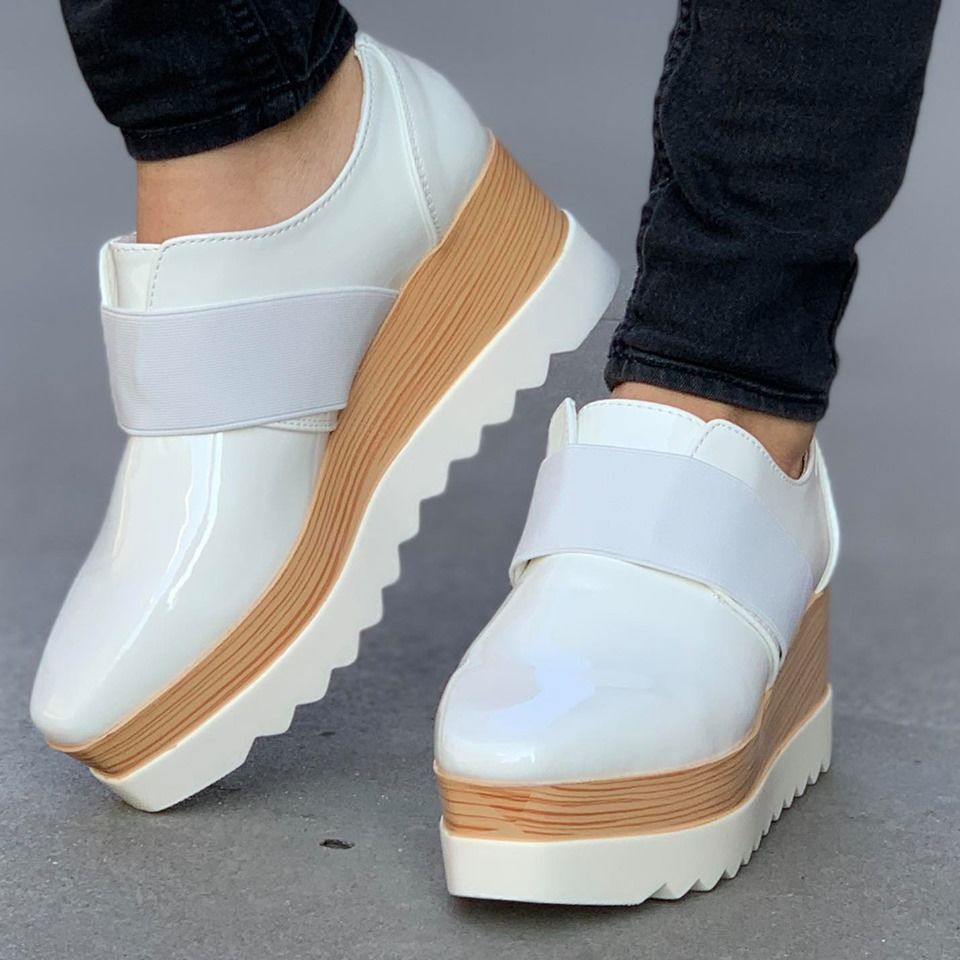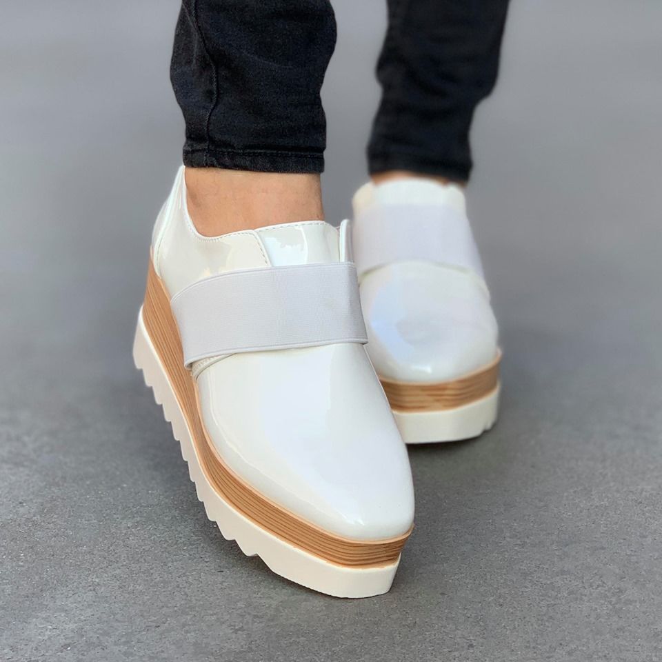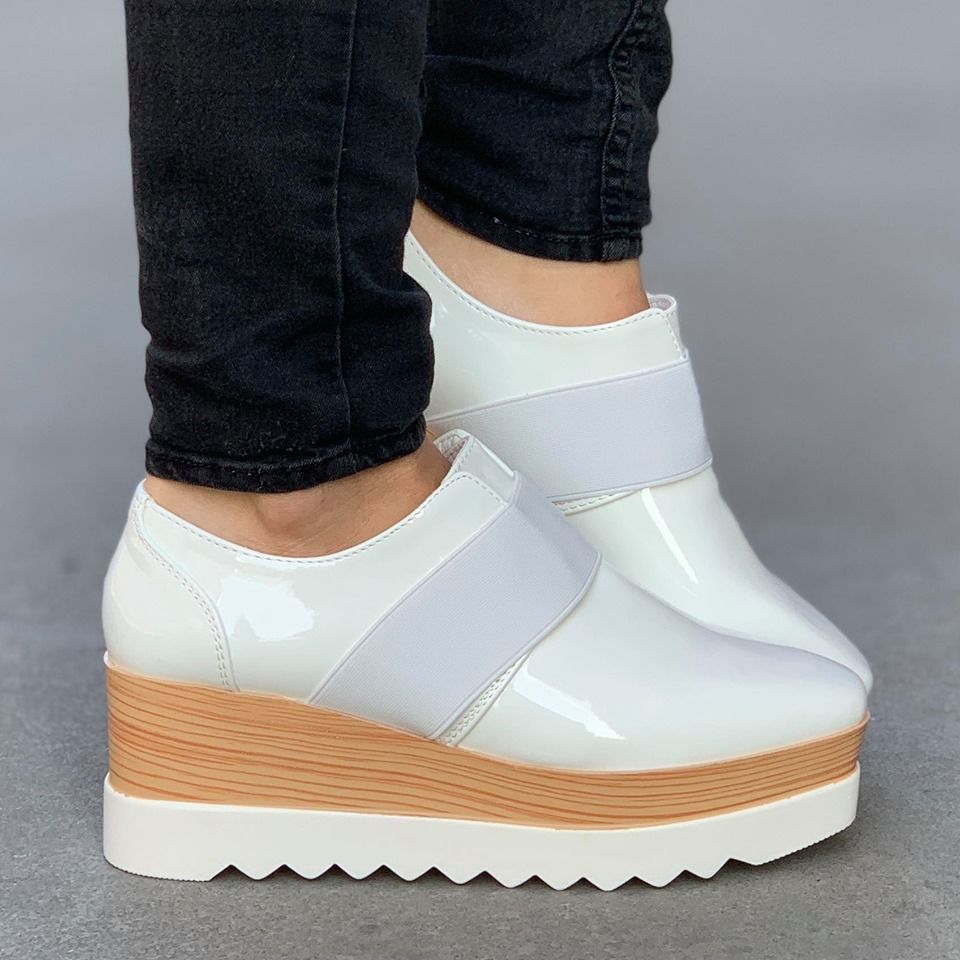 Дамски обувки с висока подметка в бял цвят. Модела е изработен от  лак и еко кожа и са с ластик. Подметката е олекотена, удобна и комфортна за вашето ходило.
