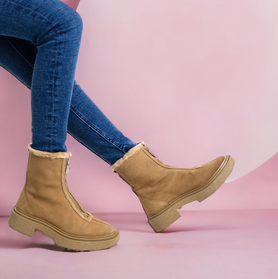 Дамски бежови боти естествен велур  - Judy - Beige