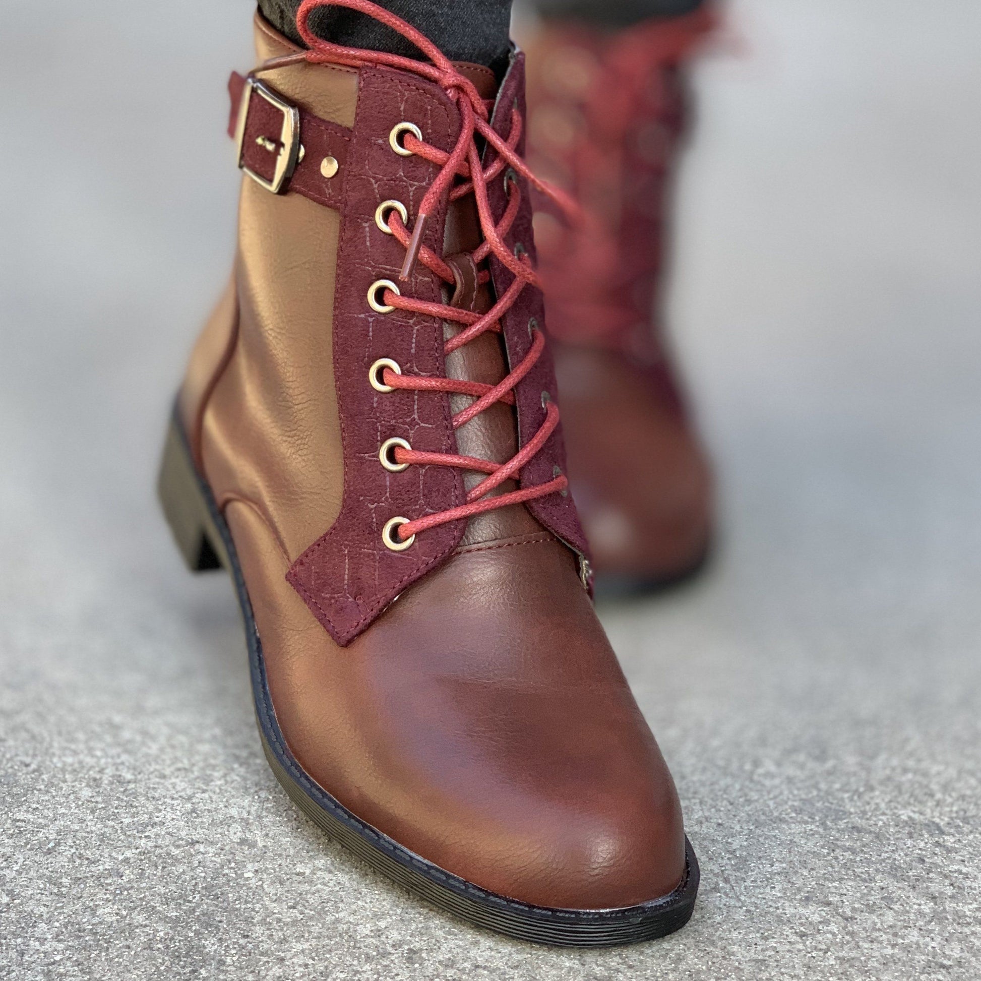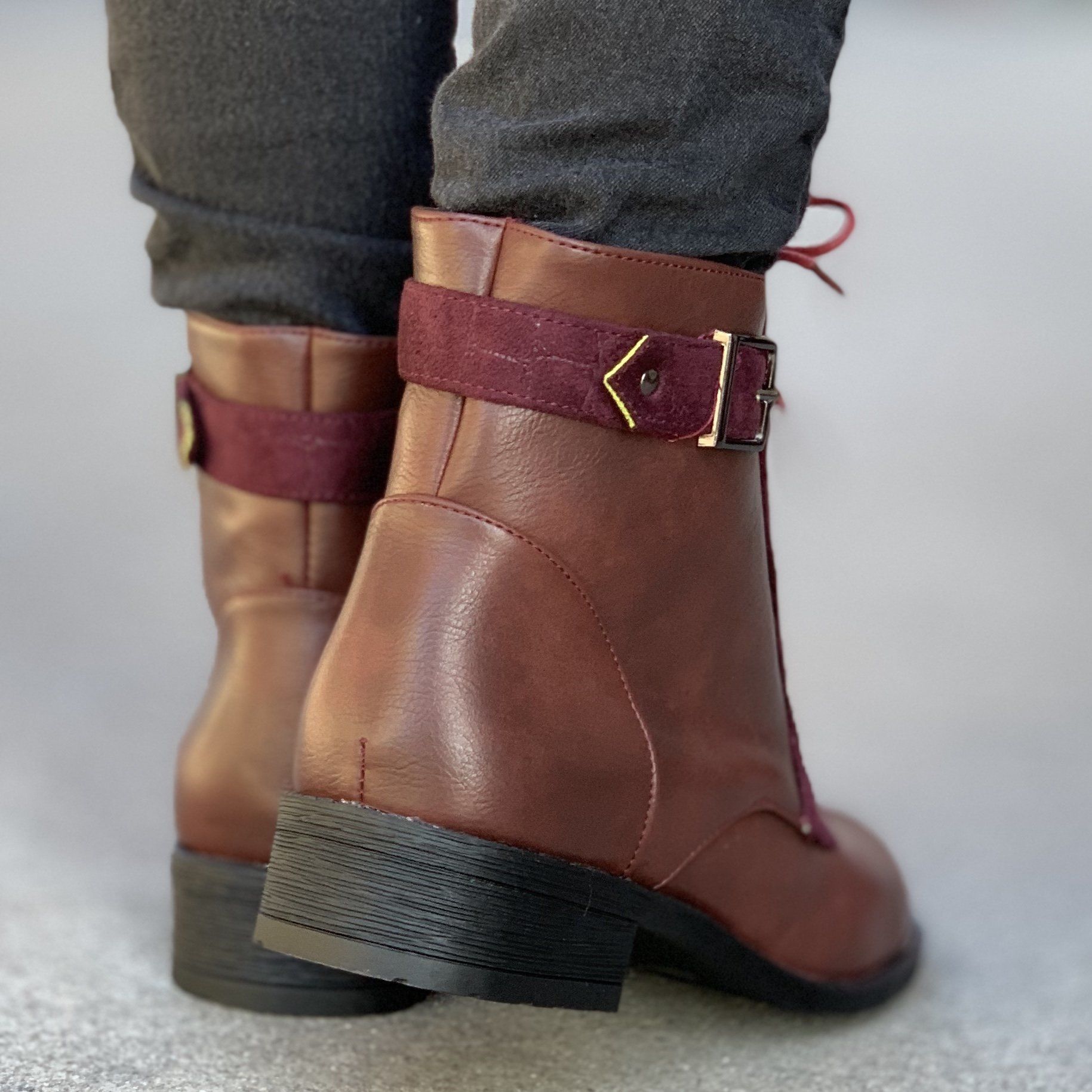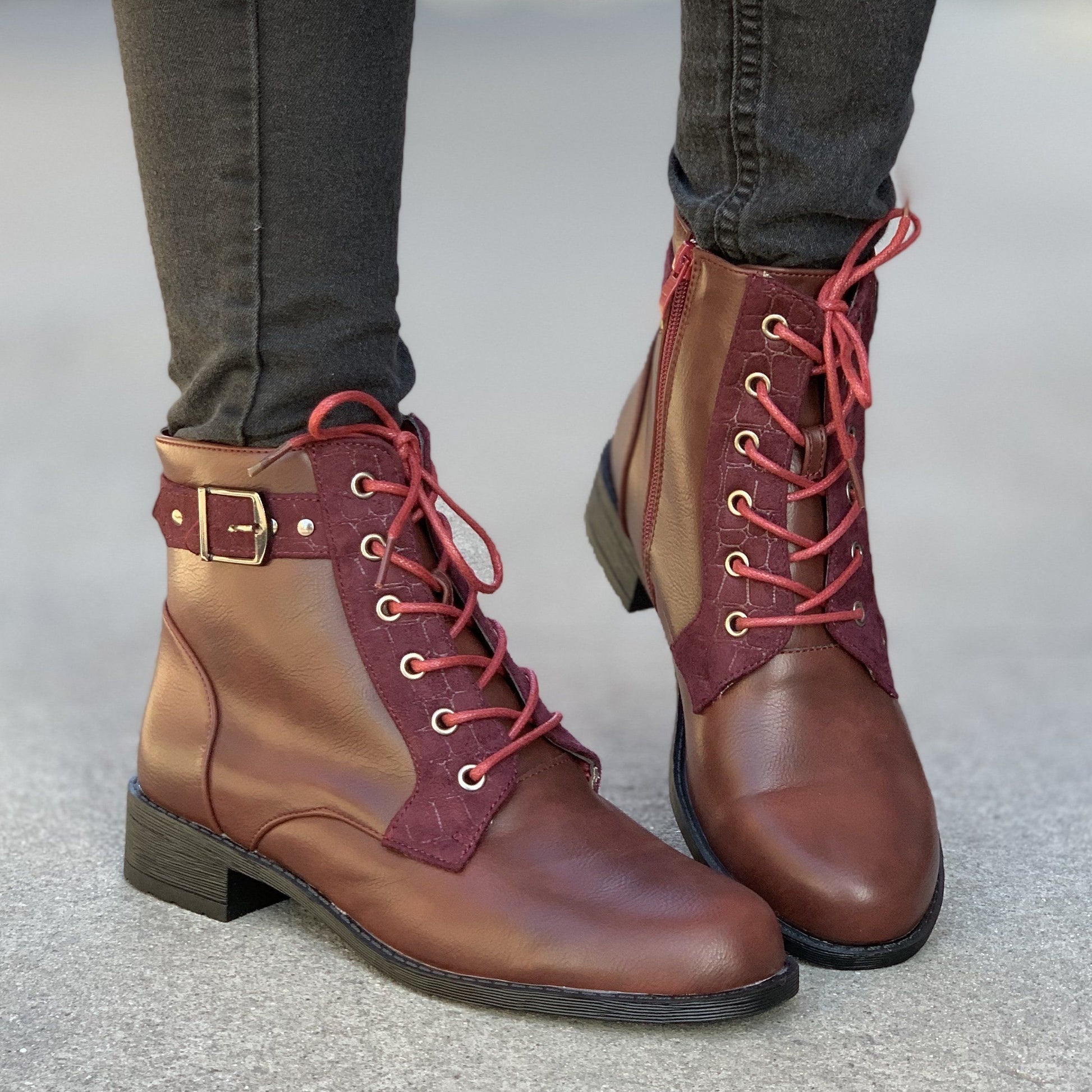 Ежедневни дамски боти в цвят бордо. Изработени са от  еко кожа, а отвътрешната страна са с тънка подплата .  Модела е с цип и връвки, уникален, изчистен дизайн  и се обуват много лесно. От външната страна на обувката има и декоративни каишки.