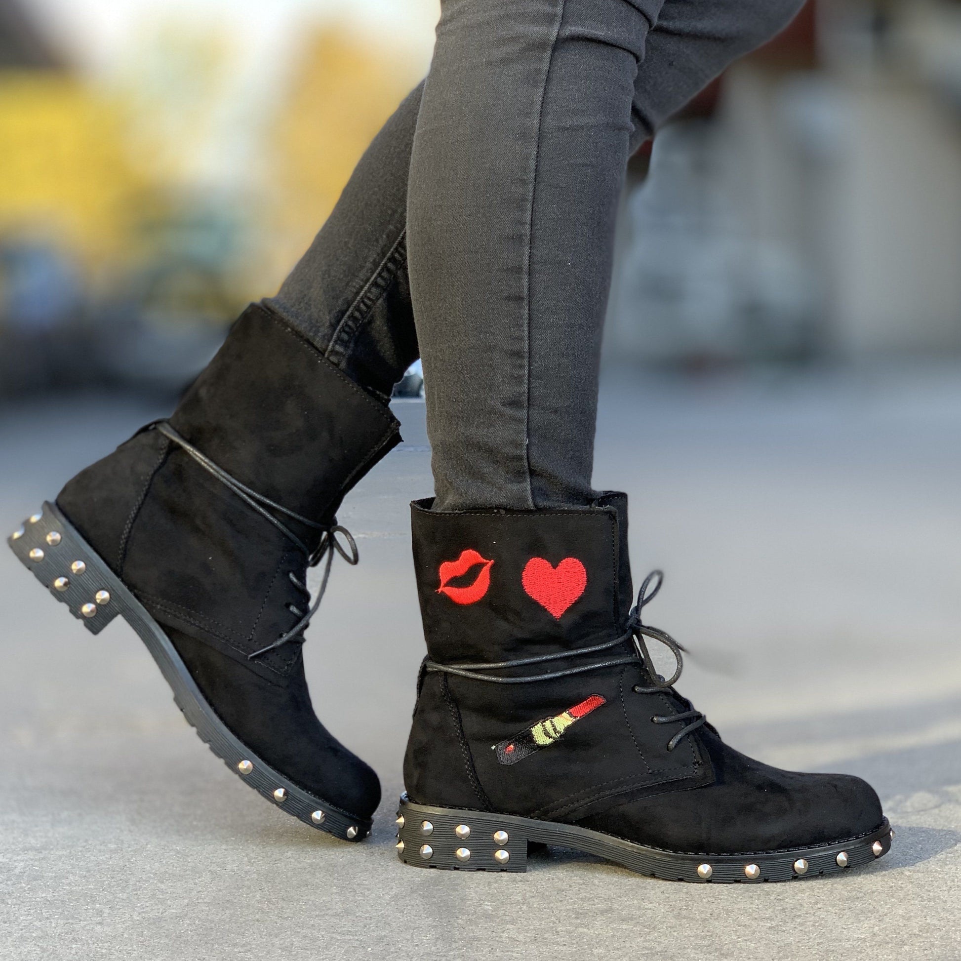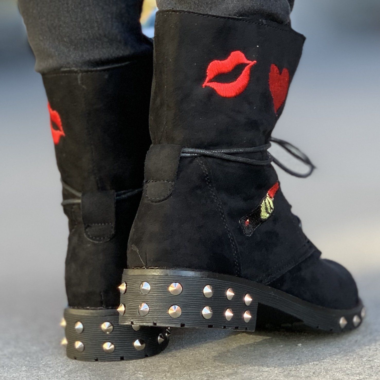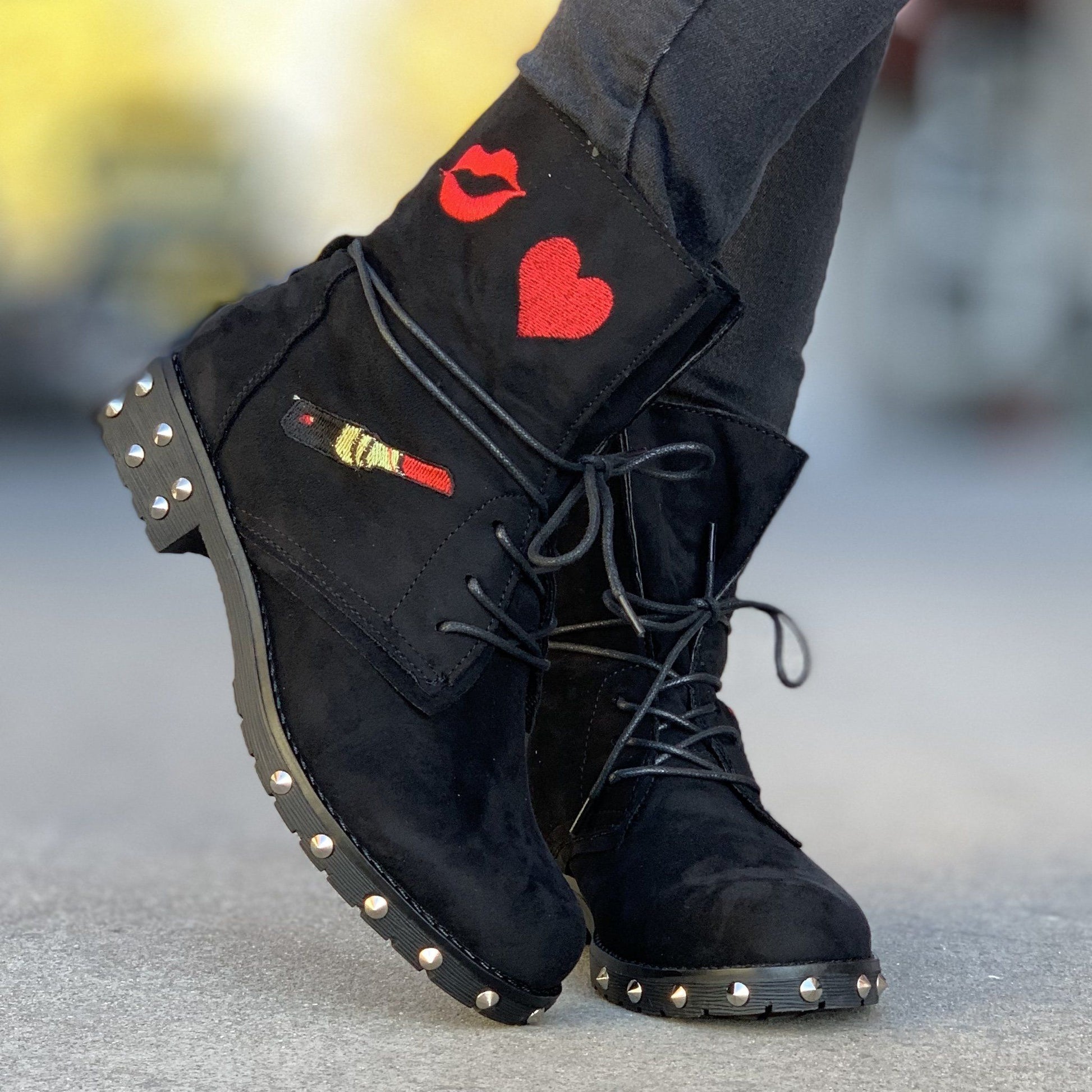 Ежедневни дамски боти в черен цвят. Обувките са изработени от велур, а отвътре са с тънка подплата. Модела е с декоративна бродерия и шипове по цялата част на подметката.