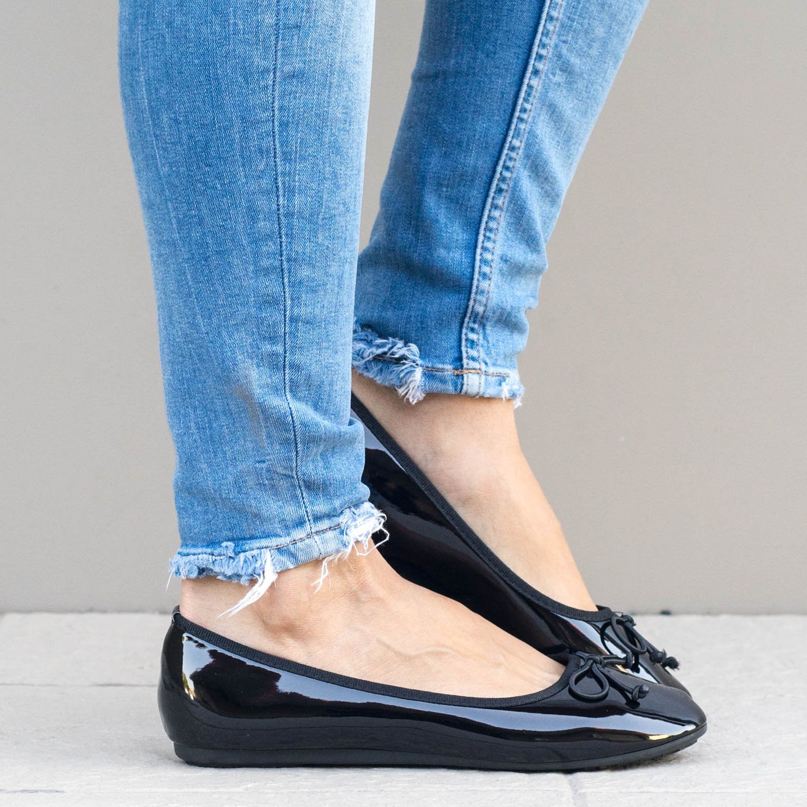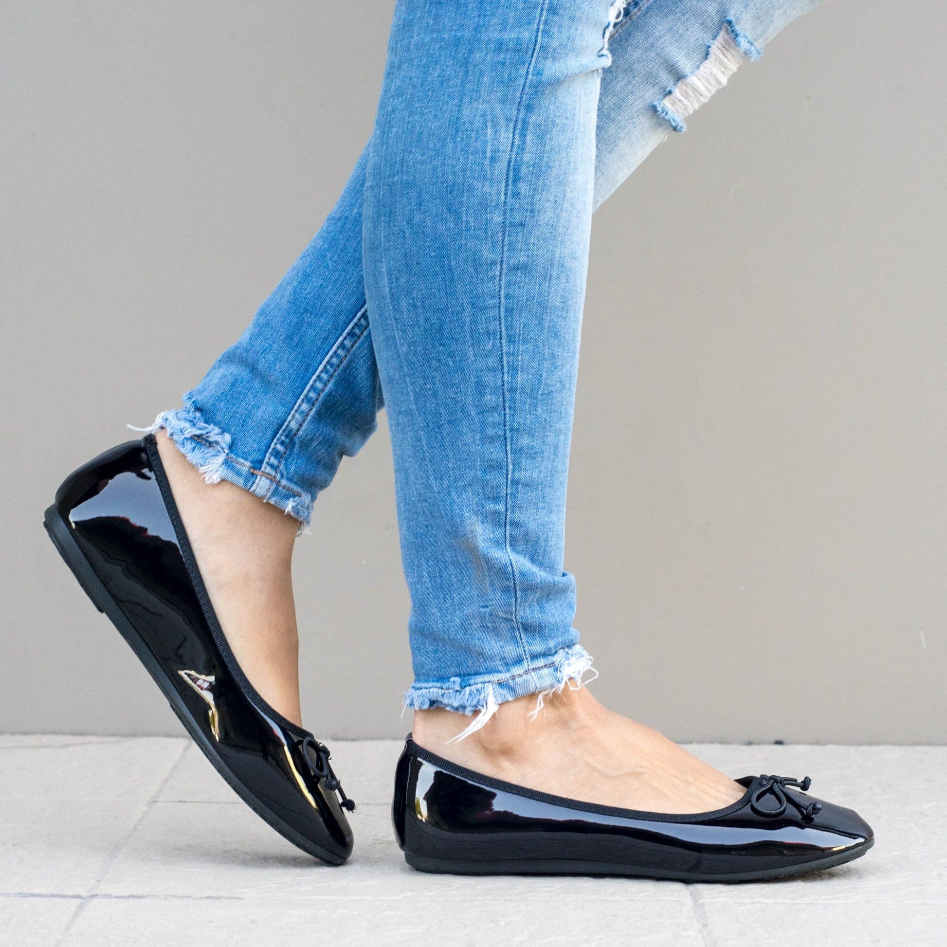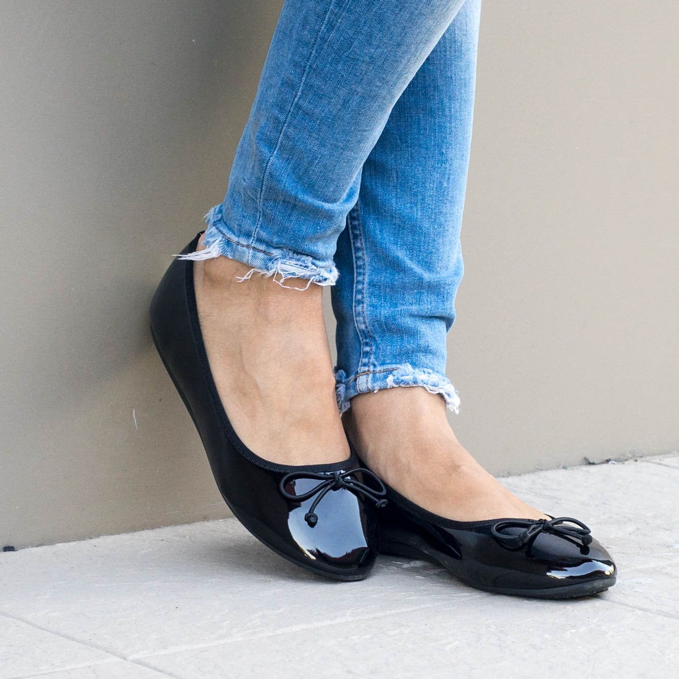 Дамски еспадрили в черен цвят с тънка подметка. Модела е изработен от лак, а подметката от гума. Обувките са с декоративна панделка в предната част на модела.