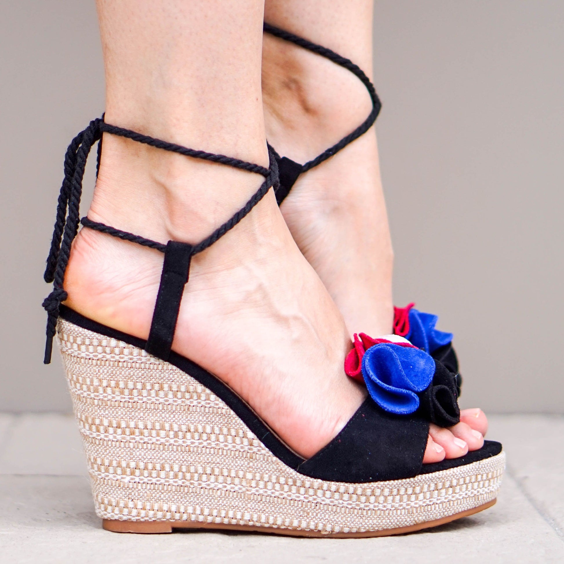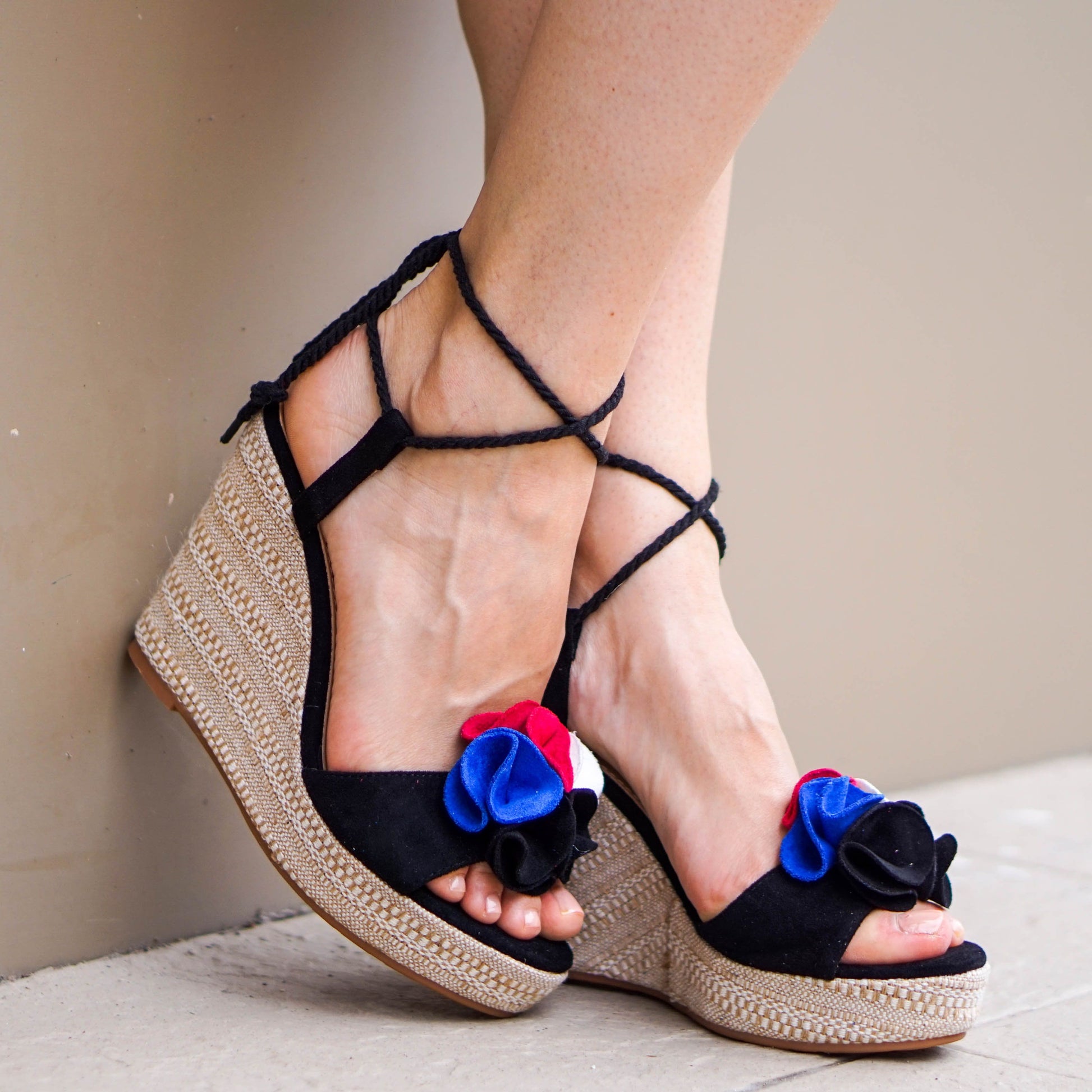 Ежедневни дамски сандали на платформа в черен цвят. Изработени са от текстил и велур. Модела е с уникален дизайн и стилно плетиво по цялата платформа. Сандалите са с връвки и декоративно цвете в лицевата част на обувката.