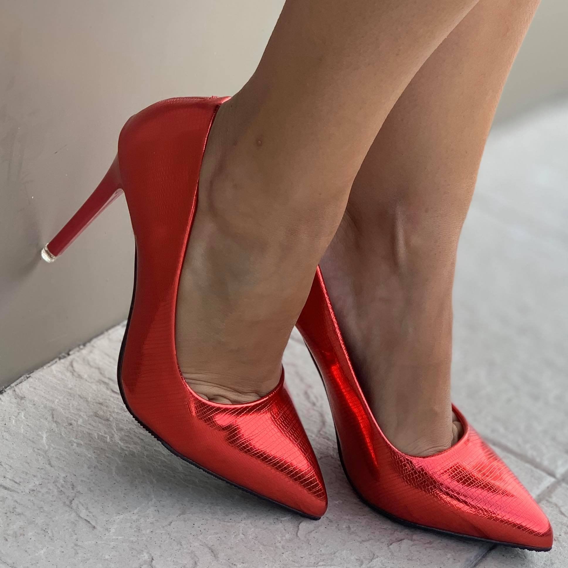 Дамски елегантни обувки на ток в изкрящо червен цвят. Обувките са изработени от лак с щампа на прокодилска кожа. Модела е изчистен, което ги прави подходящи за по-официални събития.