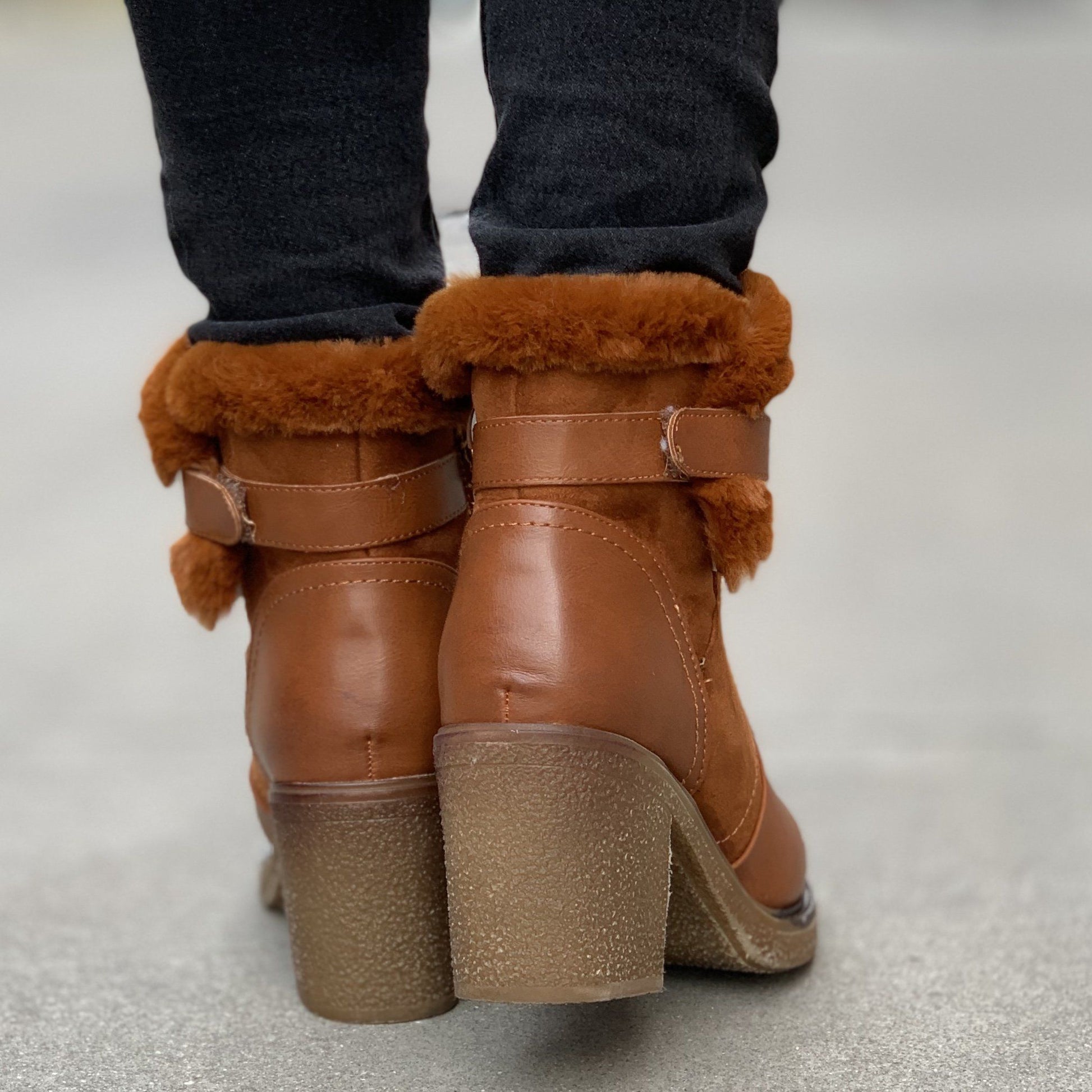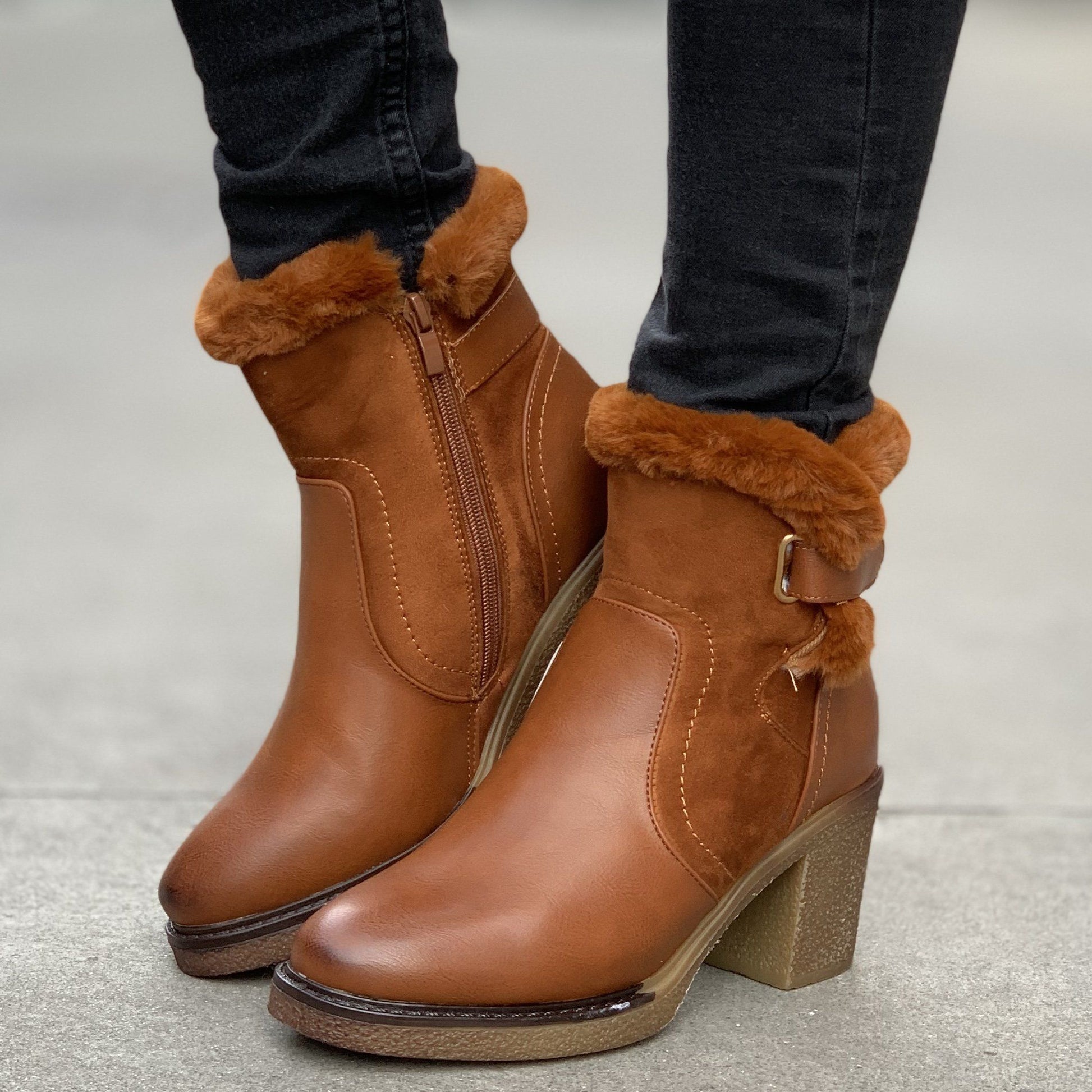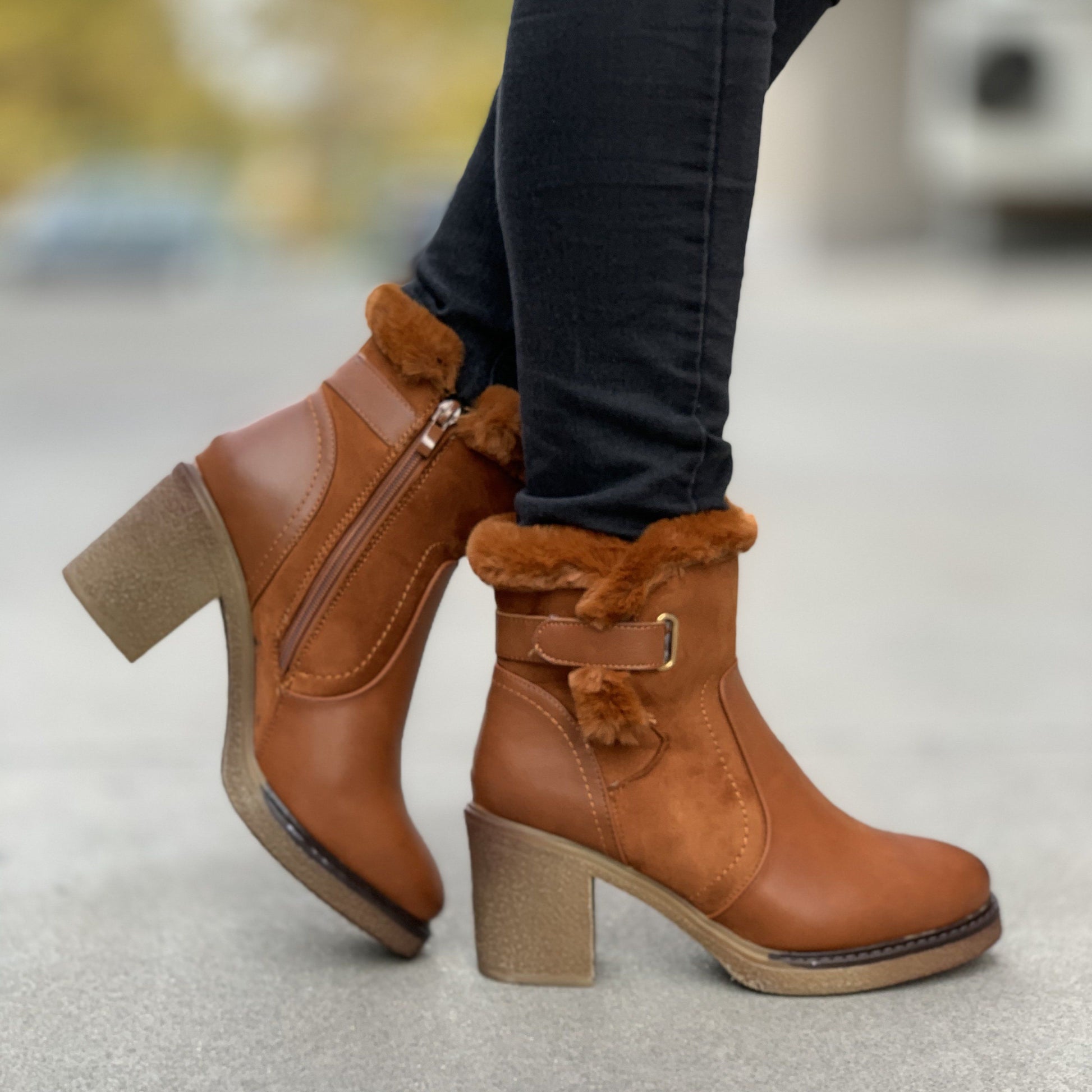 Ежедневни дамски боти в кафяв цвят. Изработени са от еко кожа и велур, а отвътрешната страна са с дебела  подплата от каракул . Обувките са с цип, което улеснява допълнително обуването и са много удобни и комфортни.