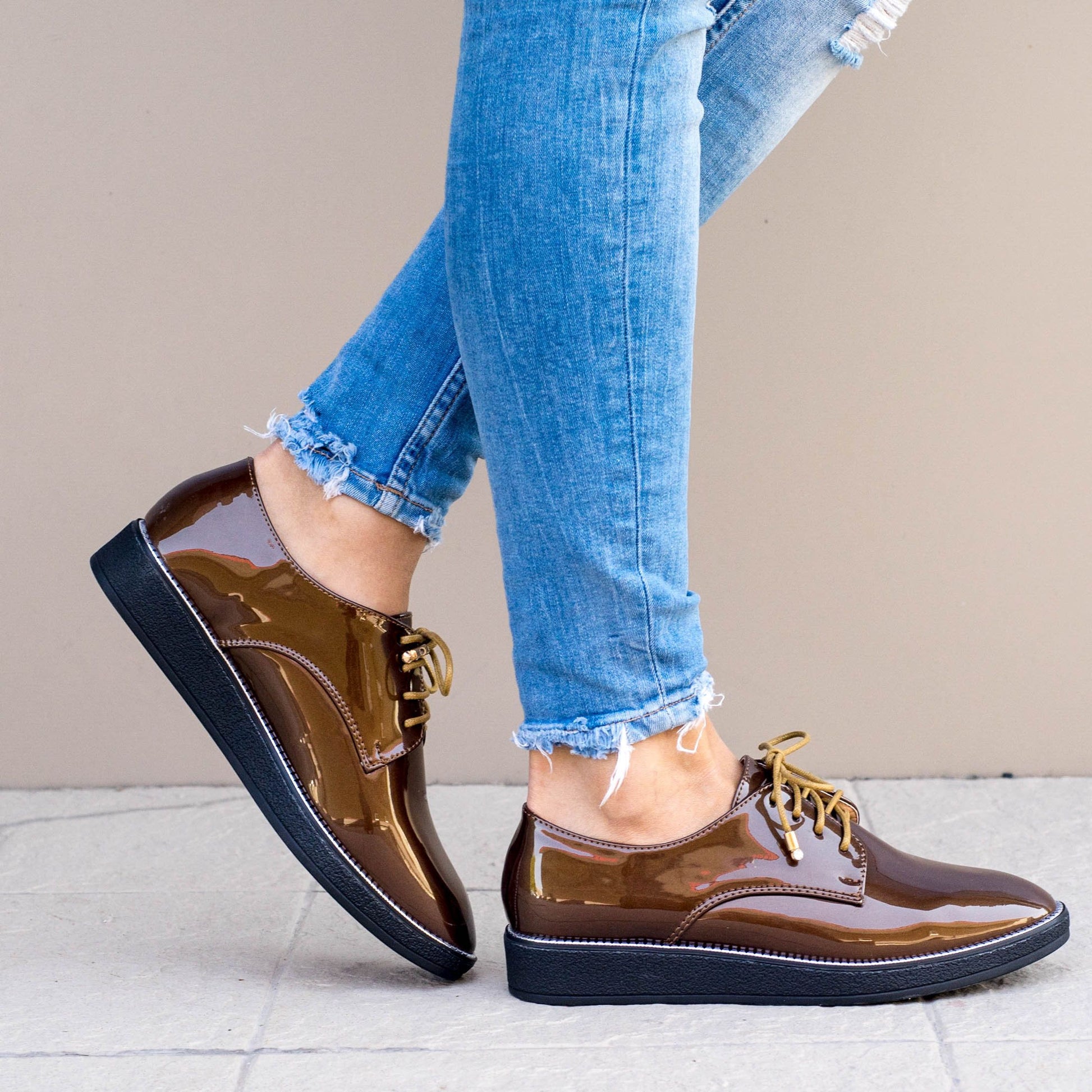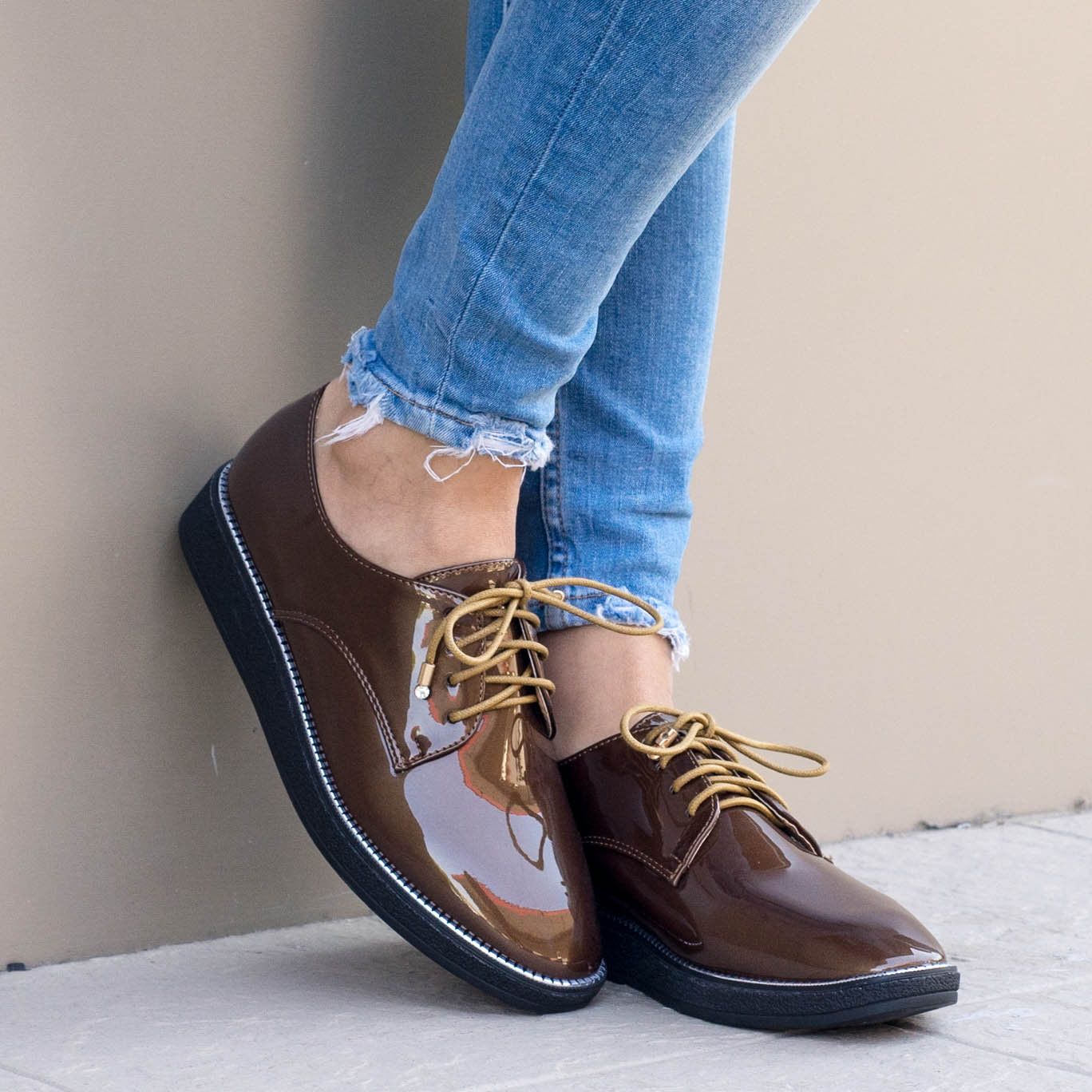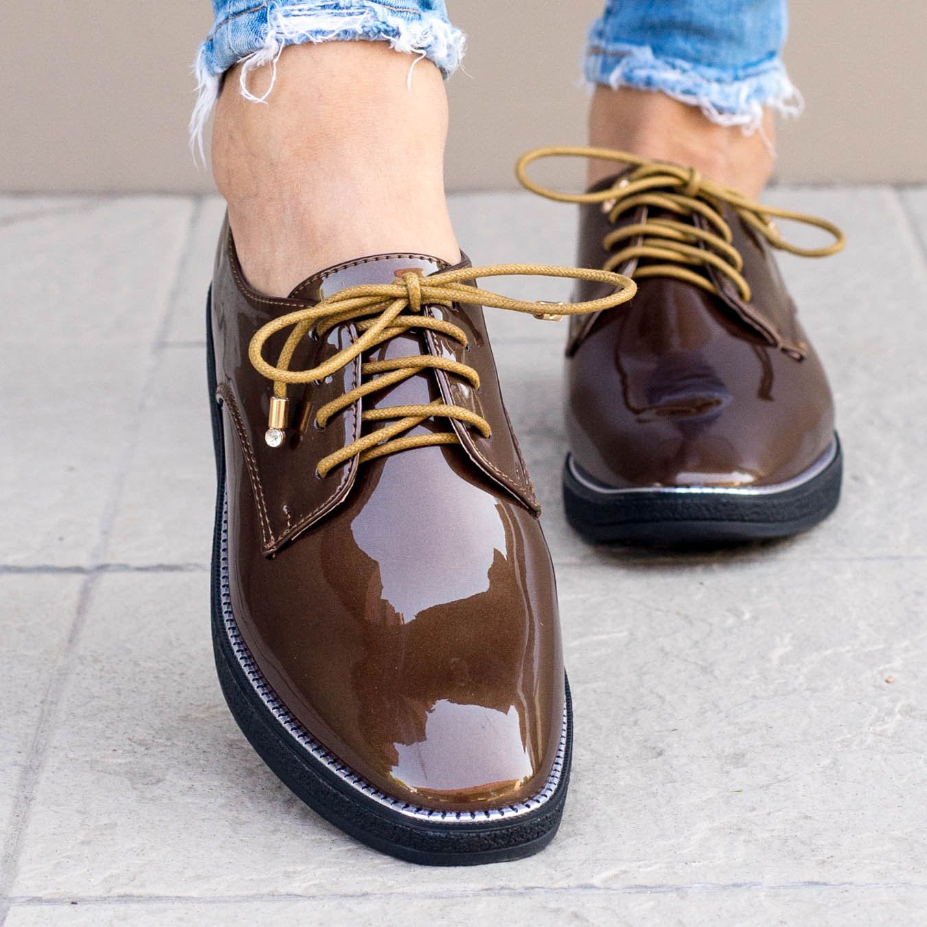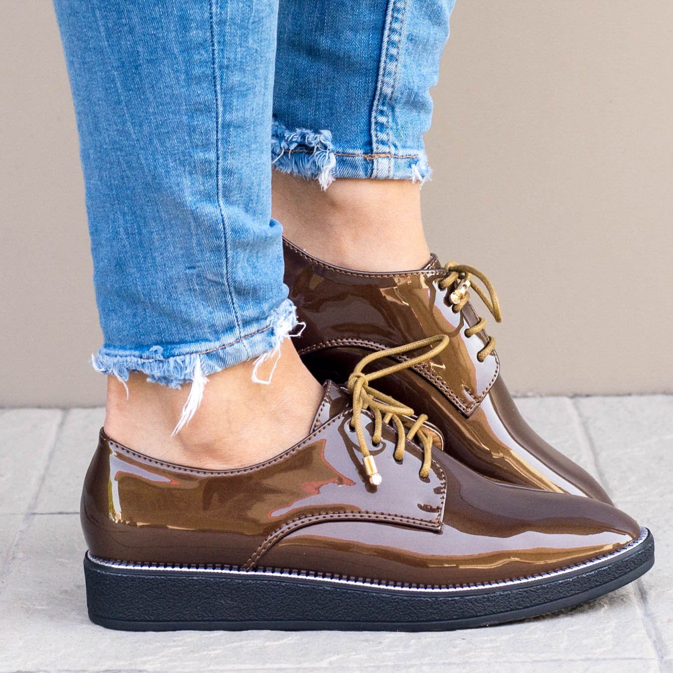 Дамски ежедневни обувки  в кафяв цвят. Изработени са от лак и са с връвки. Модела е лек, удобен, стилен и е подходящ за по официални събития също така. Обувките са изчистени,  с декоративни орнаменти по цялата подметка.
