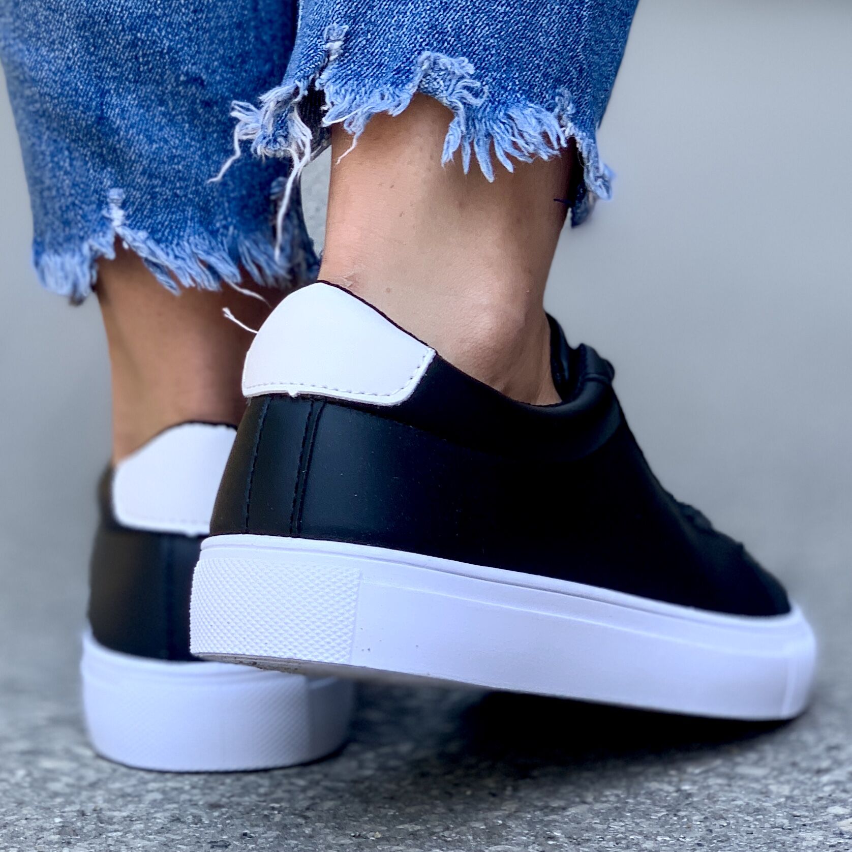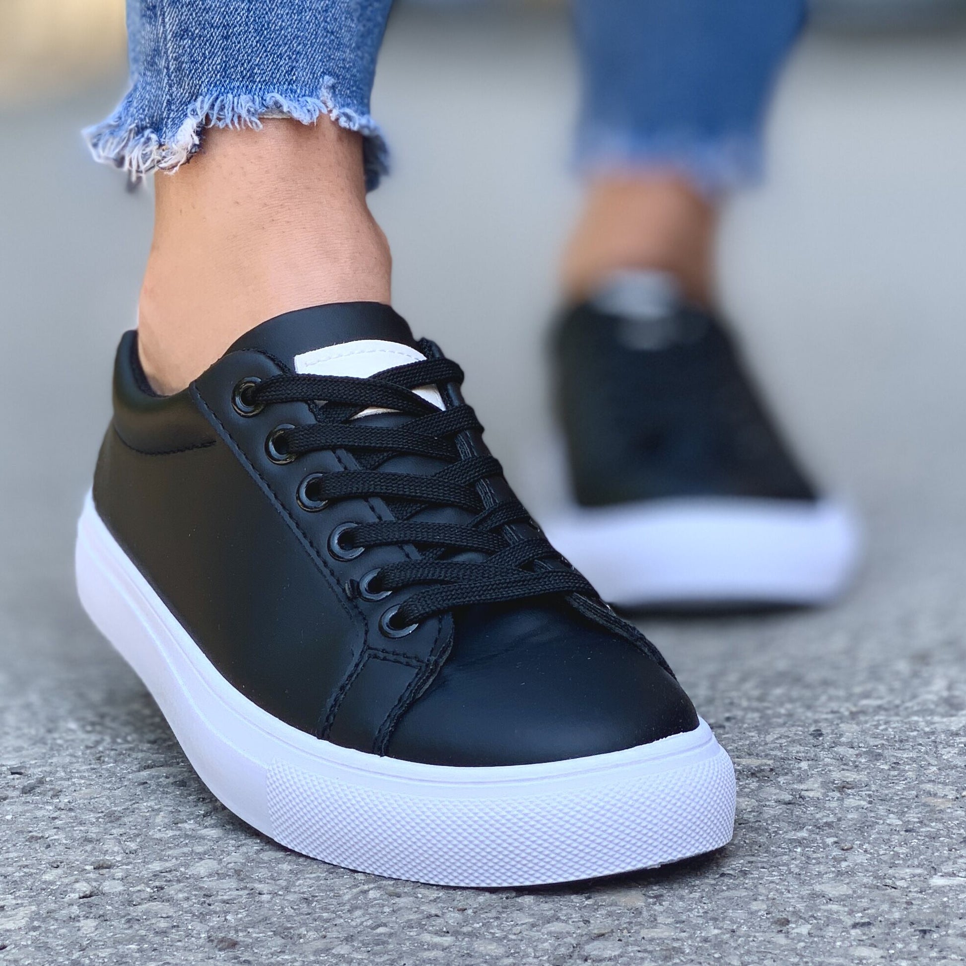 Дамски кожени кецове в черен цвят. Кецовете са изработени от еко кожа, а подметката е от гума. В лицевата част е с връвки, което ще спомогне за регулиране на ширината на кецовете.
