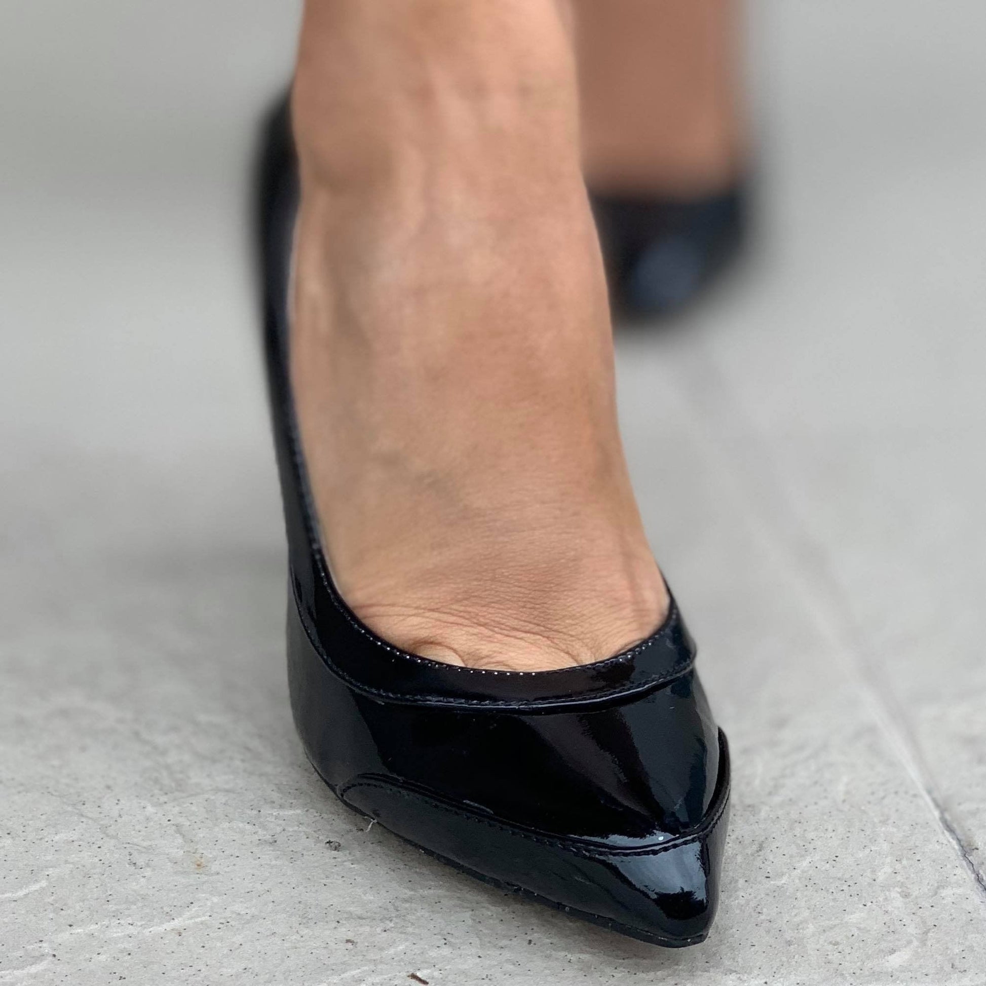 Дамски класически елегантни обувки на ток в черен цвят. Обувките са изработени от лак със заострена предна част. Модела е изчистен, което ги прави подходящи за по - официални събития.