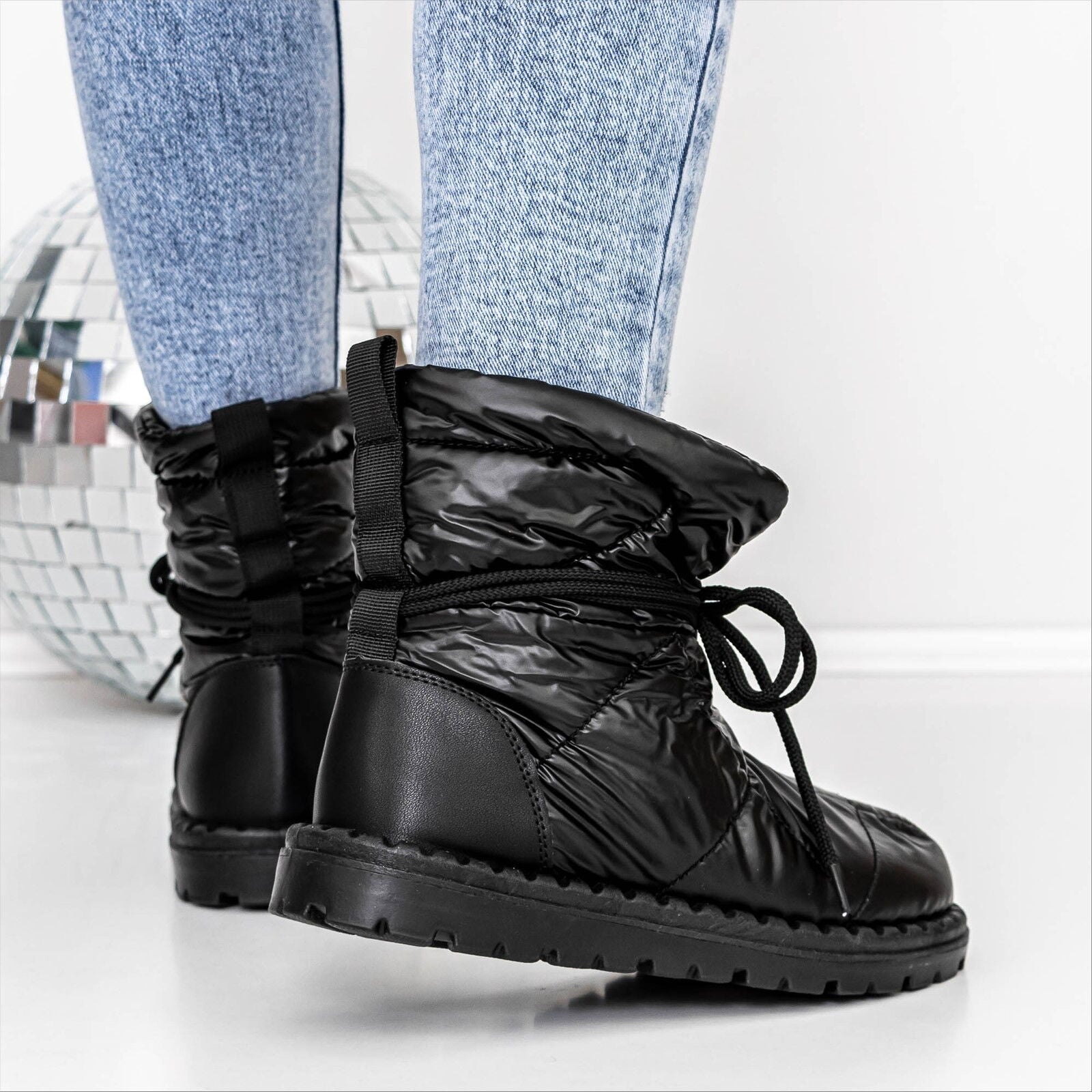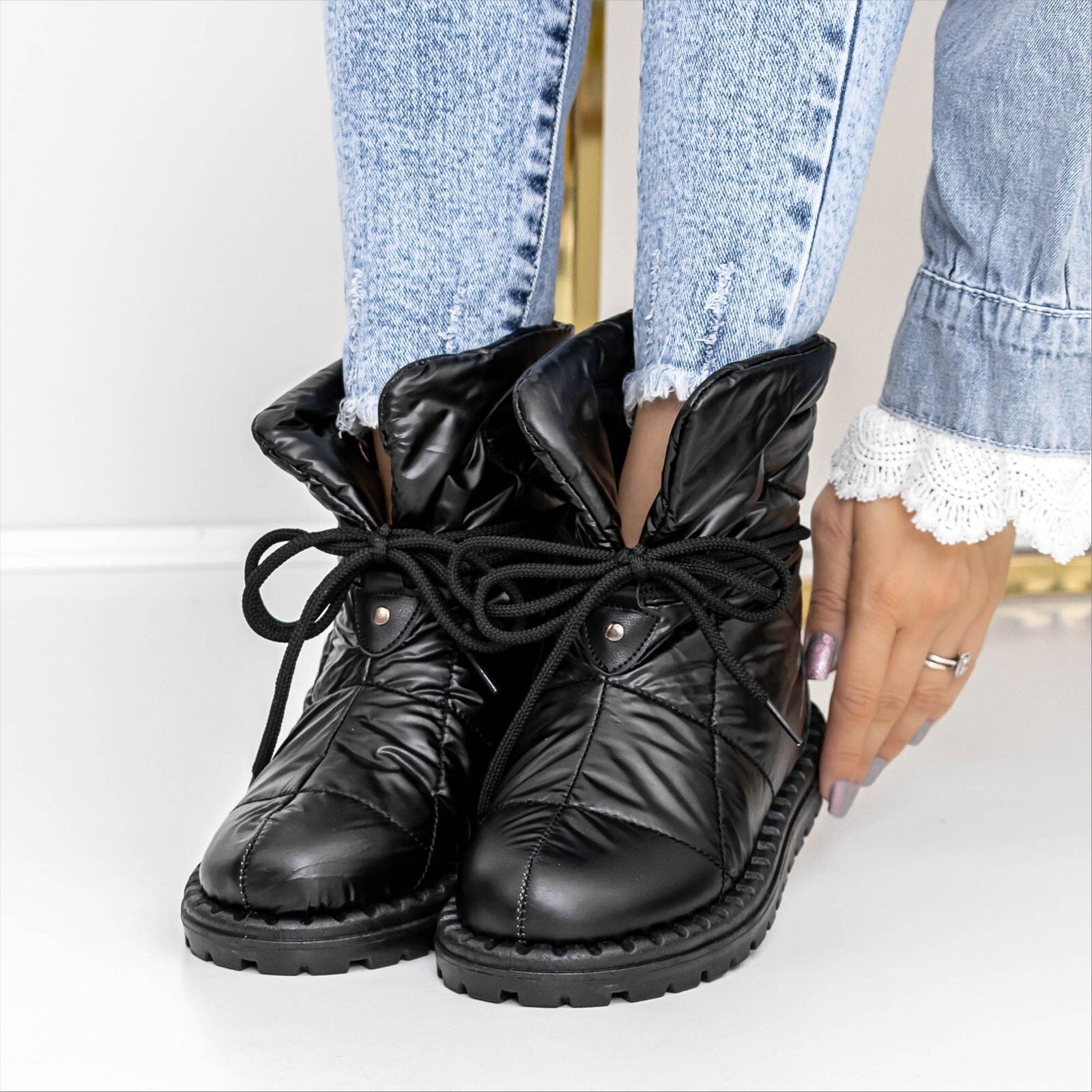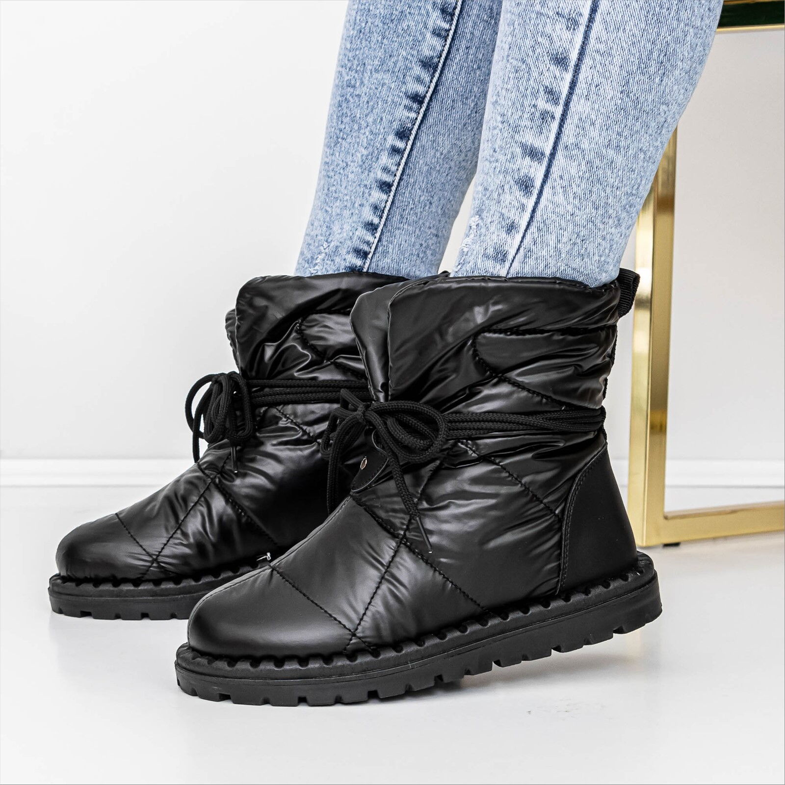 С тези дамски обувки можете да бъдете сигурни, че ще изглеждате елегантно и модерно, независимо от времето навън. Черният цвят ги прави изключително универсални и подходящи за комбинация с различни зимни облекла – от джинси до пухени якета. Дизайнът с връзки не само добавя стил, но и позволява на апреските да се адаптират перфектно към формата на крака, осигурявайки максимален комфорт през целия ден.