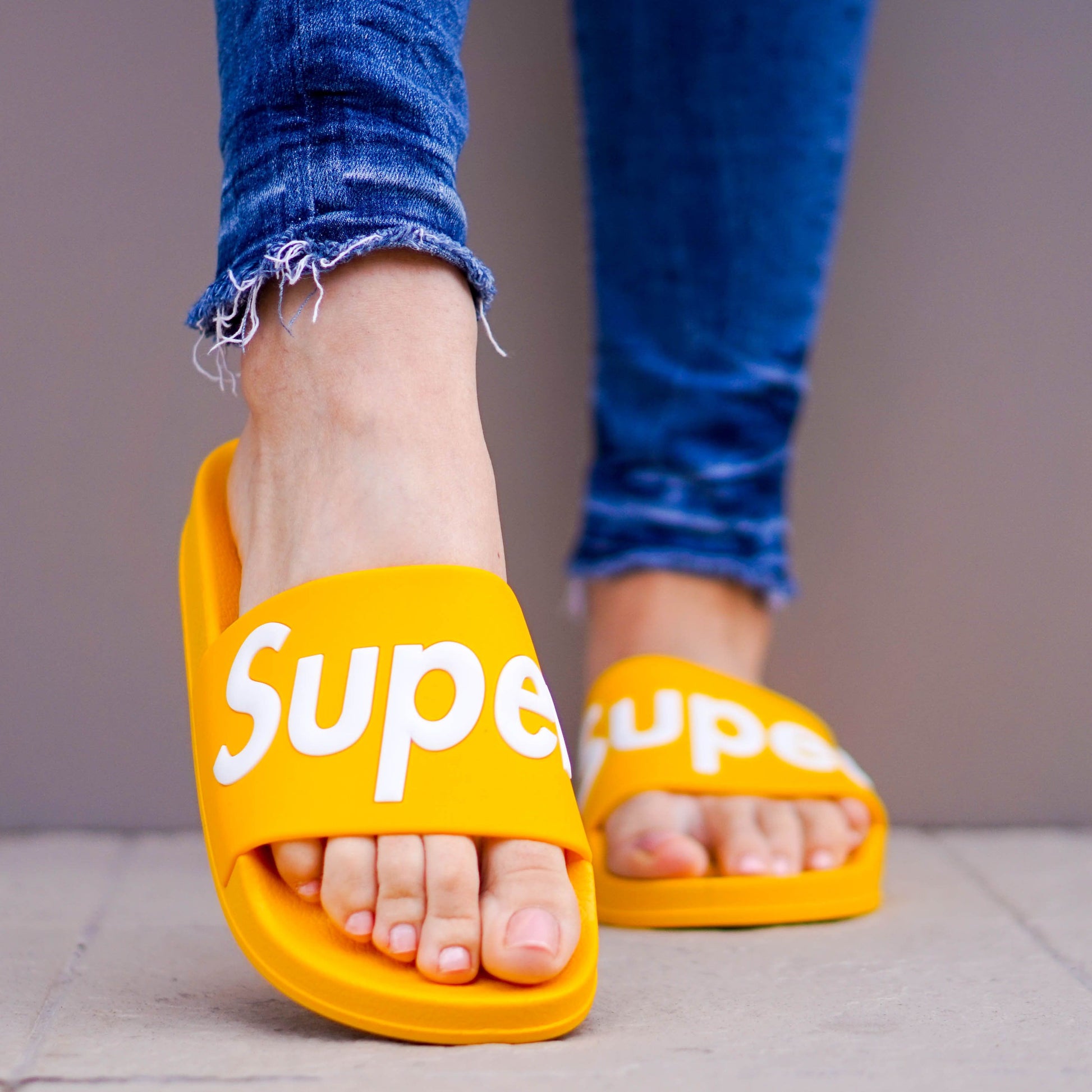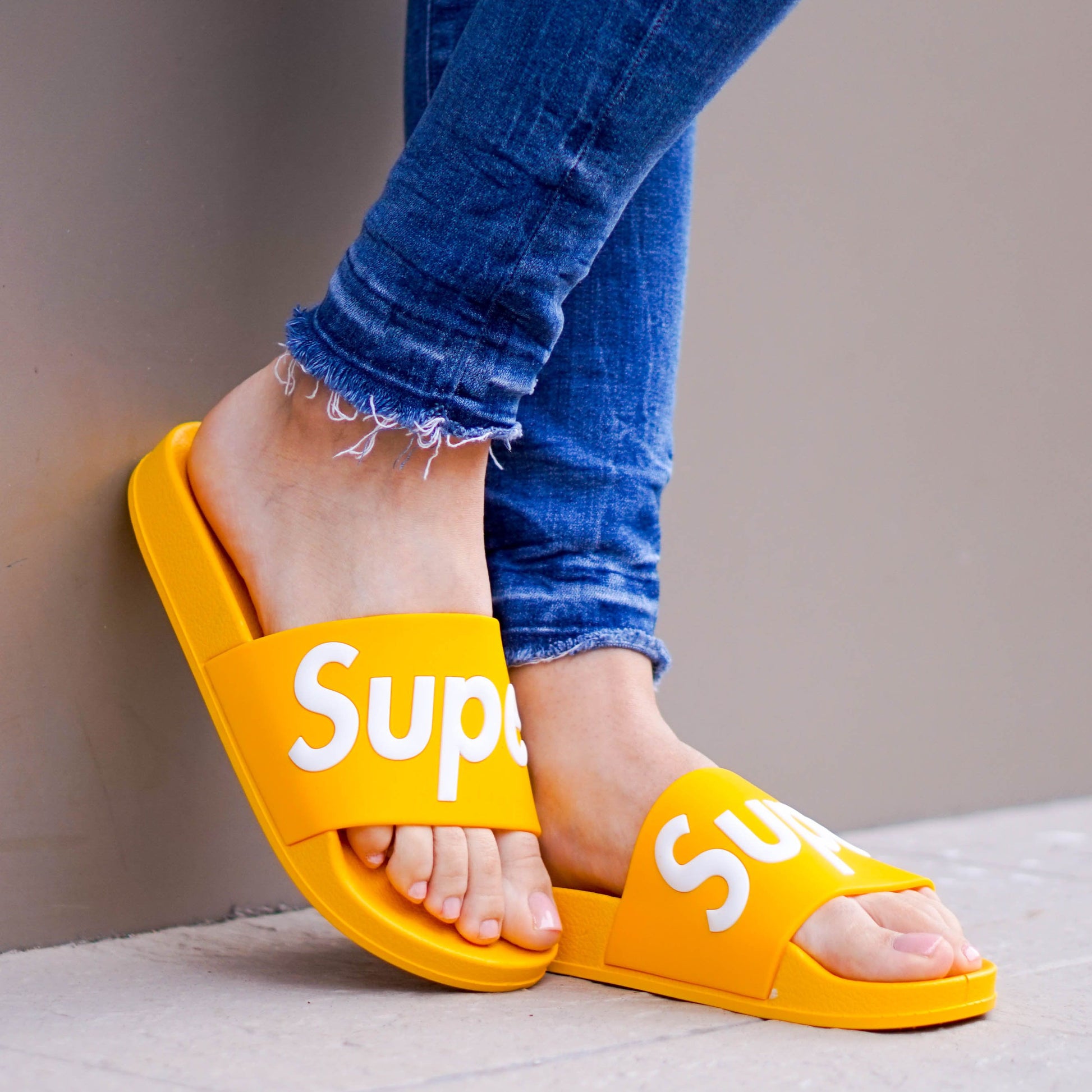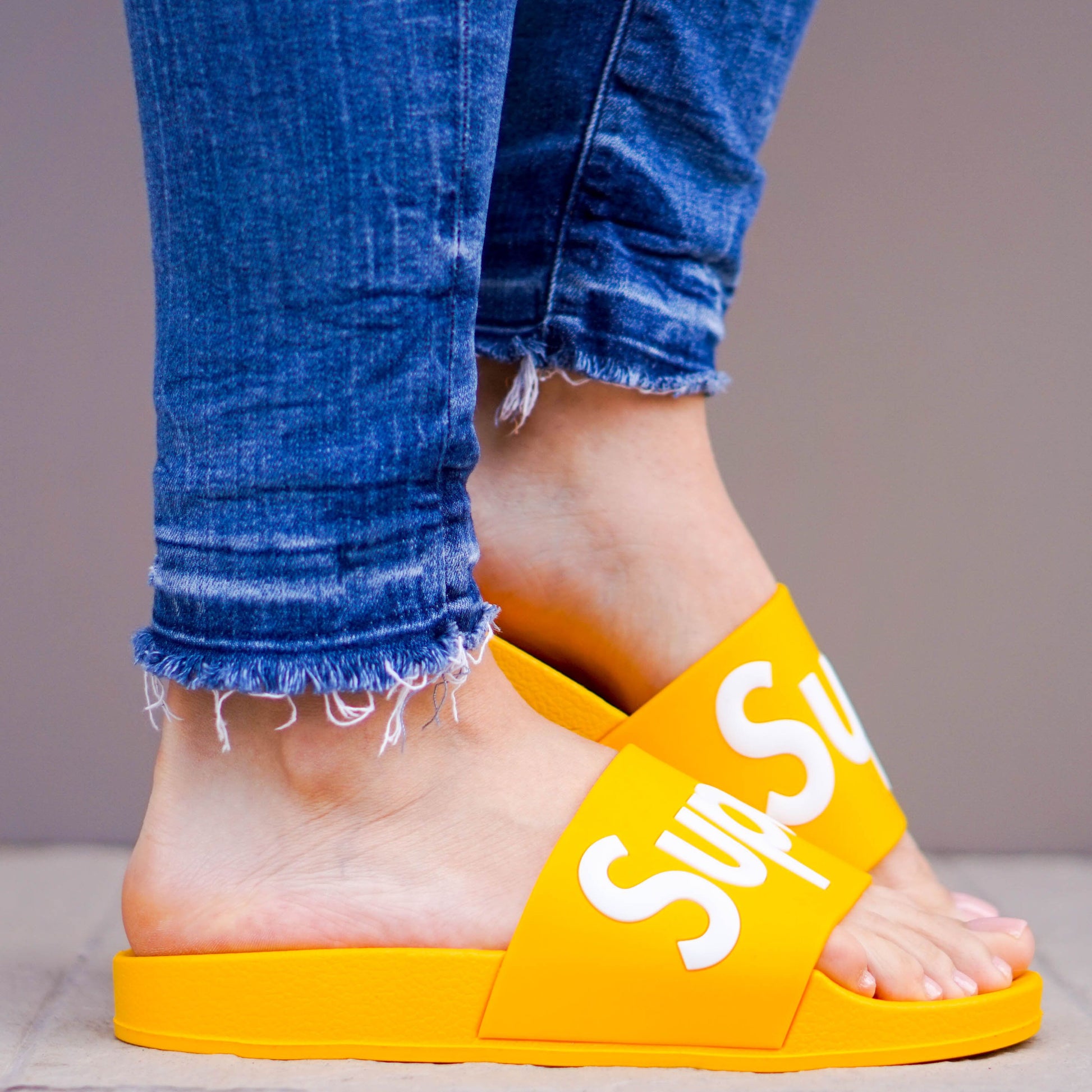 Ежедневни дамски чехли в жълт цвят. Изработени са от текстил, а подметката е от гума и е олекотена. Модела е с надпис в лицевата част.