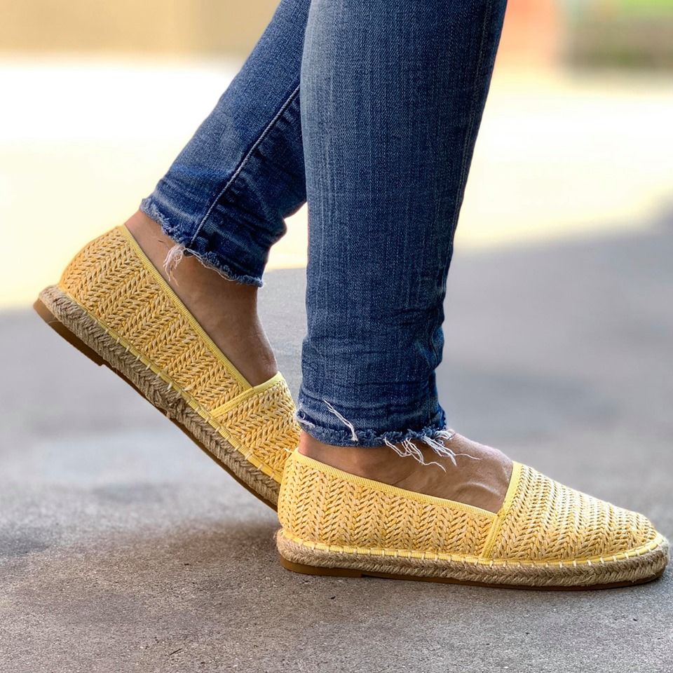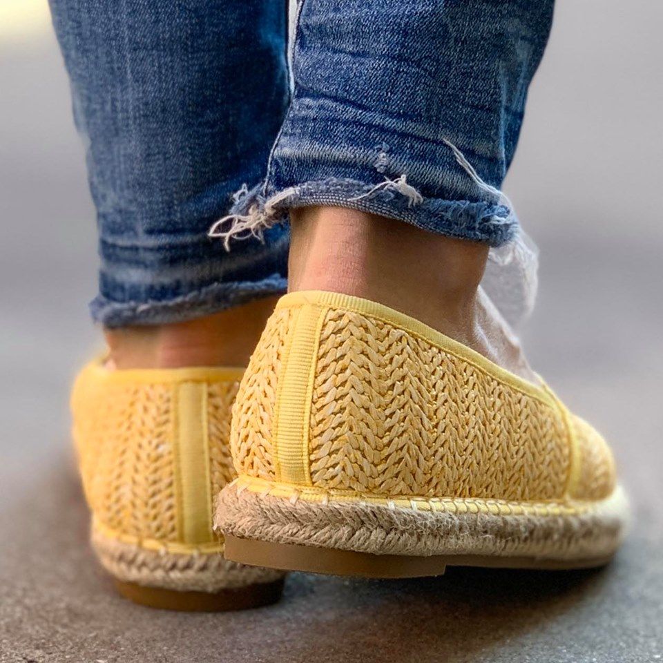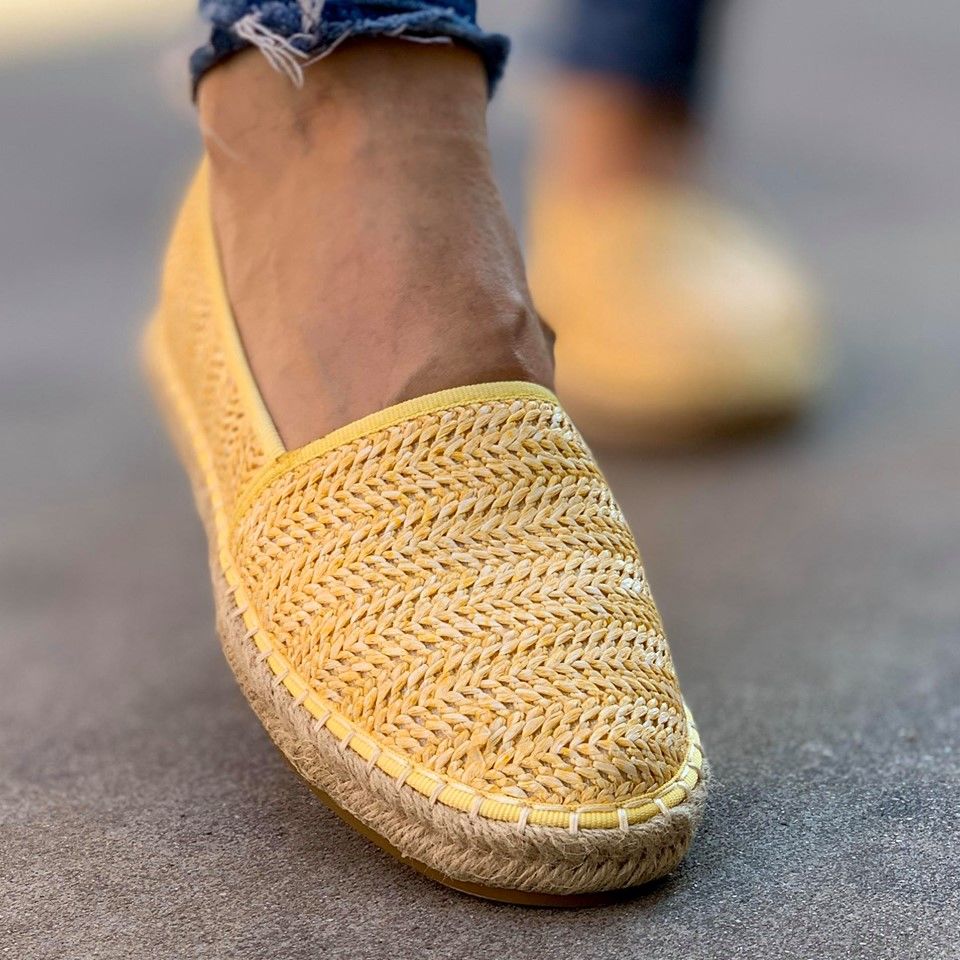 Дамски ежедневни еспадрили в жълт цвят. Модела е изработен от текстил, а подметката от гума покрита с канап. Обувките са изцяло в черен цвят, изчистени и са без връвки.