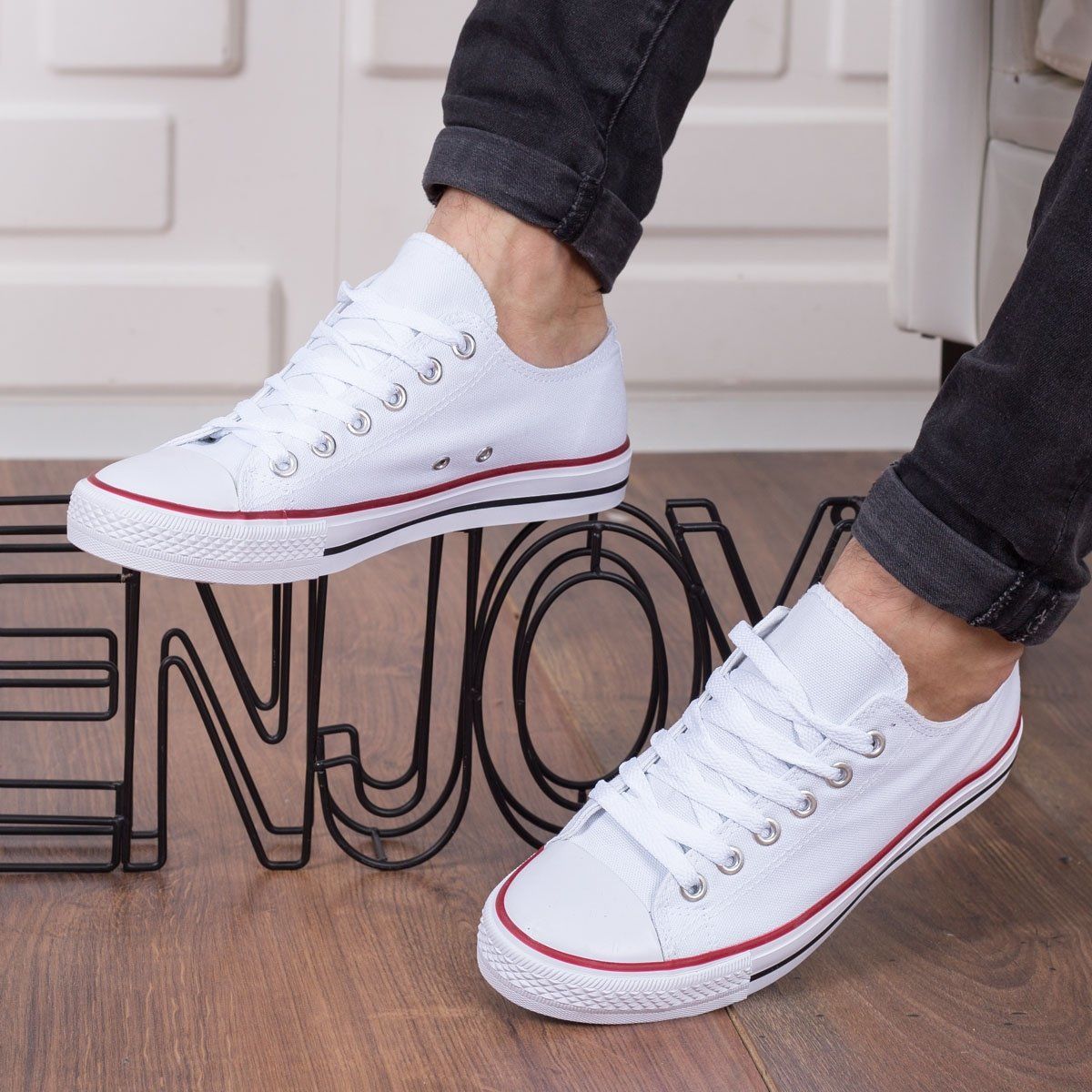 Мъжки ежедневни кецове в бял цвят . Кецовете са изработени от плат и гумена подметка. Модела е подходящ за топлите сезони.Модела е от колекция Есен-зима 2017г.
