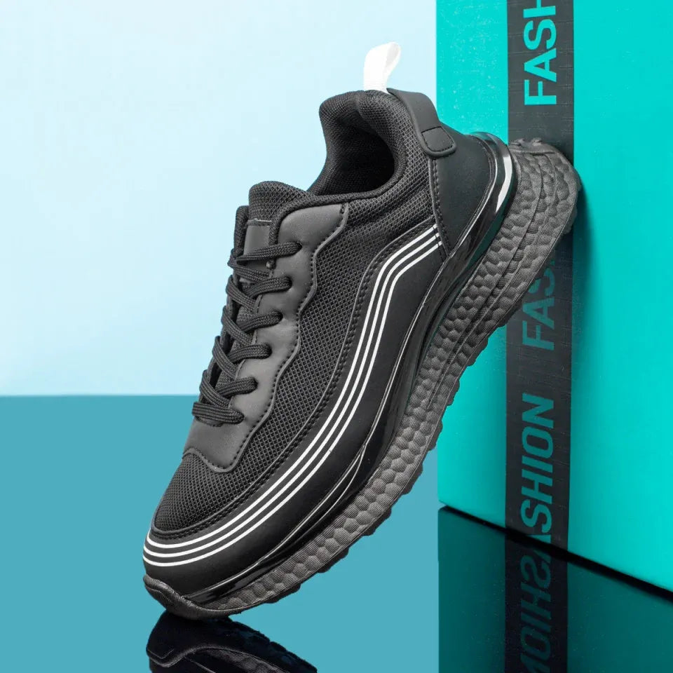 Подсилете вашия стил и комфорт с нашата нова колекция мъжки маратонки! Нашите маратонки с черен цвят, декорирани с три вълнообразни бели ленти, представляват перфектната комбинация от стил и функционалност. Съчетанието от еко кожа и мрежест текстил на горната част на маратонката придава модерен вид и позволява вентилация на краката.