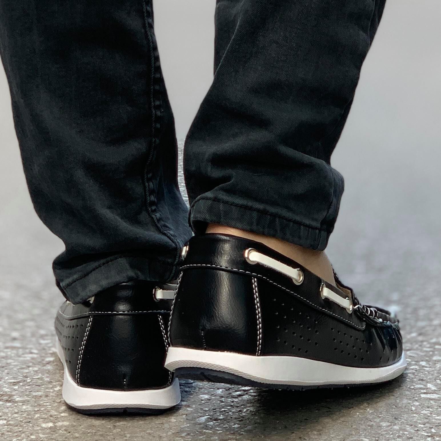Мъжки летни мокасини в черен цвят. Обувките са изработени от еко кожа и бяла гумена подметка. Модела е на дупки, което го прави поджодящ за топлите летни дни.